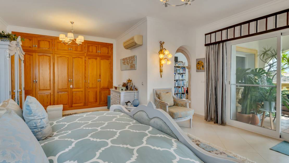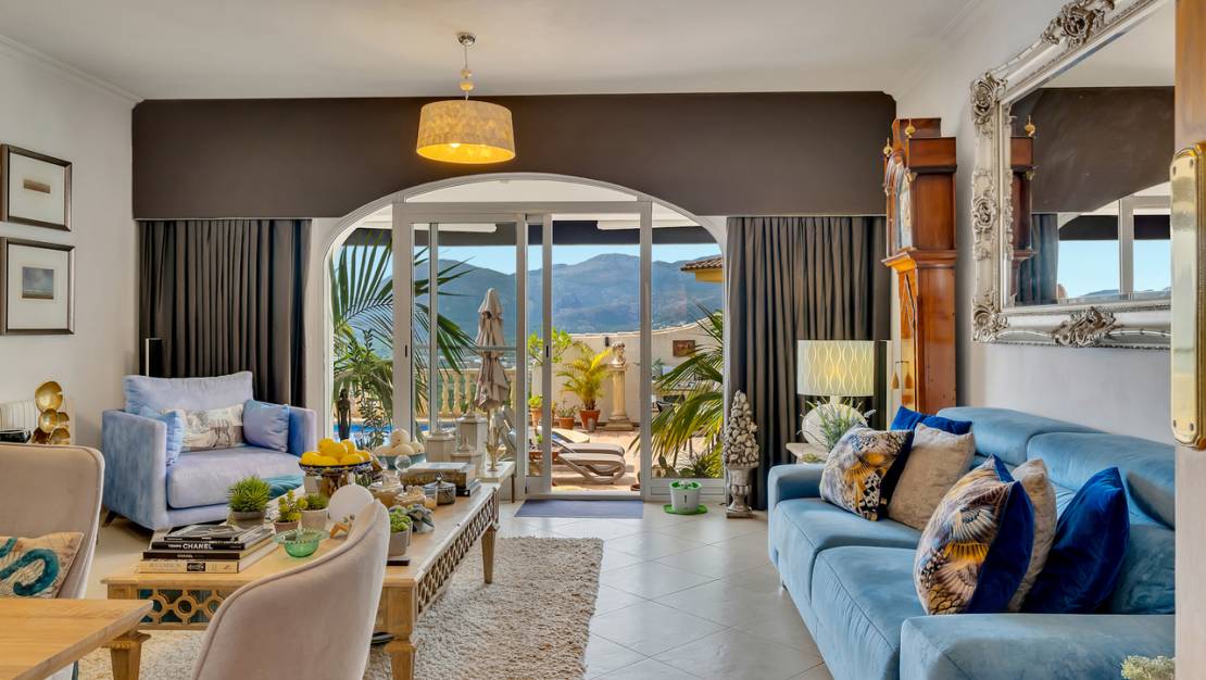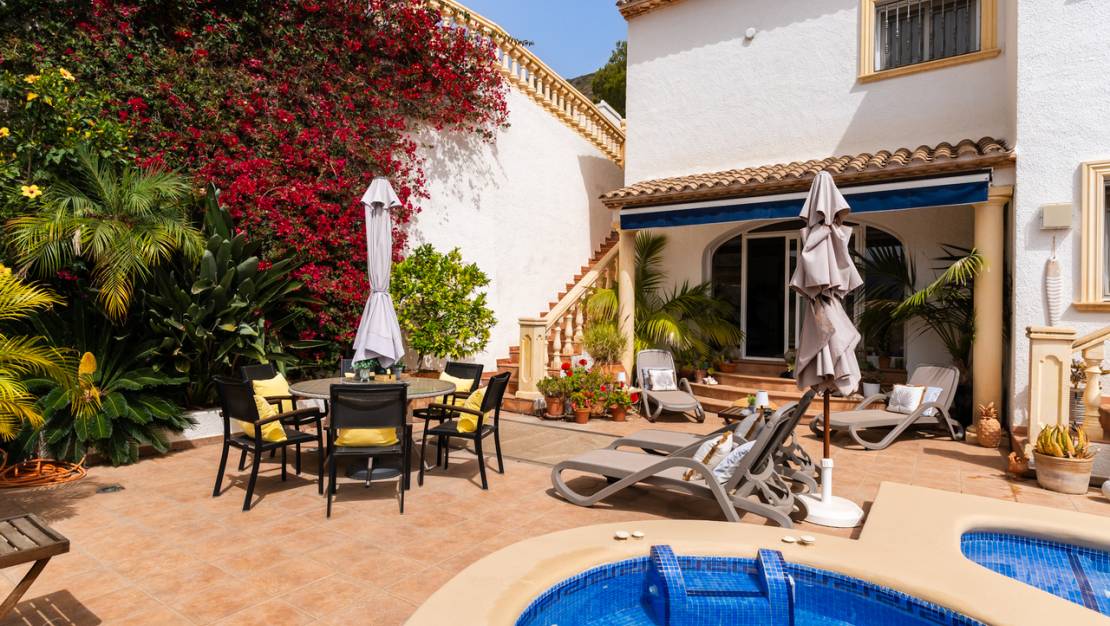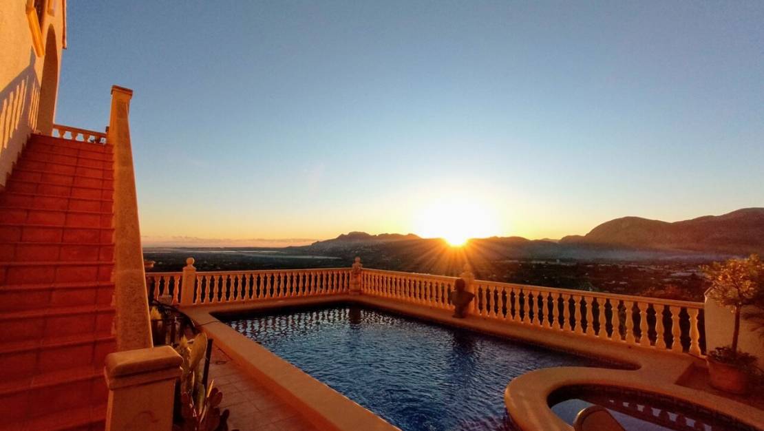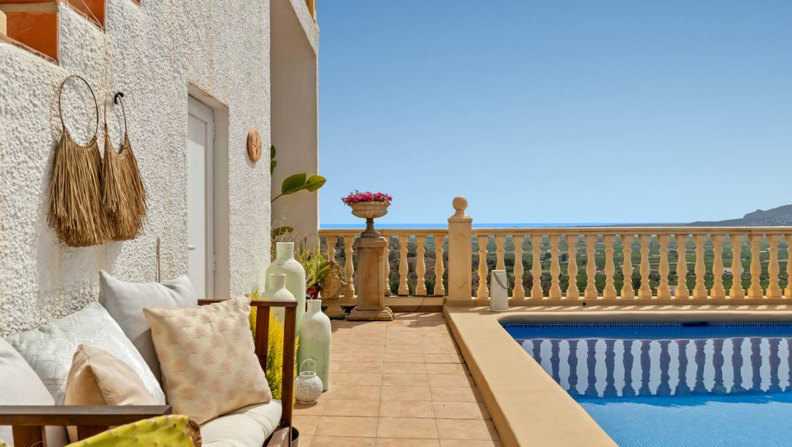 Nestled within the exclusive Mostalla urbanization, this stunning 2005-built villa located on a private ‘no through’ road boasts unparalleled views and a prime location between the charming town of Pego, the picturesque Santa Ana beach, and the Marjal Nature Reserve. Significantly upgraded by the current owners, this spacious and unique property offers exceptional living space, including a main two-level house and a separate apartment.The villa's top-floor accommodation, accessed at street level, features a welcoming hallway, two double bedrooms, a family shower bathroom, a modern and fully-equipped kitchen, and a spacious living/dining room with a log-burner and air-conditioning. This level opens up to a sea-facing covered terrace (naya) that overlooks the orange groves, mountains, and the Mediterranean.Downstairs, the owners' level comprises an exceptionally large master bedroom with a dressing area, air-conditioning, and a private terrace with sea views and direct pool access. Adjacent to the bedroom is a home office, a large bathroom with a shower and bath, a utility room, a fully-fitted kitchen, and a spacious living/dining room with superb outdoor access.A separate external staircase leads to the independent guest apartment, which boasts two large double bedrooms (one en-suite), two shower bathrooms, a large kitchen, and a living/dining area – all with uninterrupted sea views.The villa's outdoor spaces are truly exceptional, featuring a 11x5 meter heated swimming pool, a separate heated jacuzzi, a private pool shower room, and numerous seating and dining areas. The beautifully landscaped gardens, with their flowering plants, palm trees, water features, and private relaxation spots, create a wonderful sense of closeness to nature.This unique property is packed with high-end features, including numerous storage rooms, electric blinds, a wine cellar, a solar panel system (with a Huawei battery) that powers the electricity and heats the pool and jacuzzi, double-glazed windows, and a state-of-the-art security system. With powerful Wi-Fi and download speeds of 68Mbps, this villa truly offers the best of modern living in a stunning natural setting.Just a short 3-minute drive away, the charming town of Pego provides all the necessary amenities, while the beautiful Santa Ana beach and the Marjal Nature Reserve are just 10 and 5 minutes away, respectively. Perfectly situated for exploring the Northern Costa Blanca ( Denia, Javea, Gandia) this villa offers a rare combination of privacy, exclusivity, and easy access to the region's many delights.
