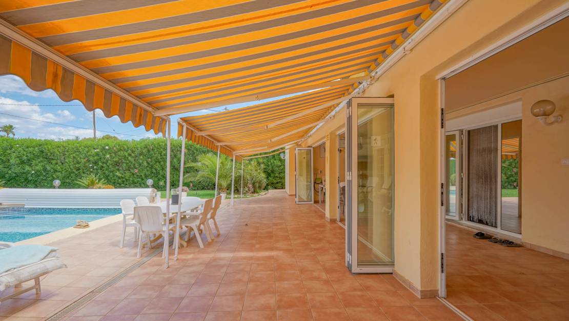 This villa is located on a flat, sunny plot of 2000 m², near the village center of Els Poblets and just one km from the beach. The villa is divided into two houses that are connected but each has its own access. The main house consists of a living-dining room, a kitchen, three double bedrooms, a bathroom and a guest toilet. In addition, there is a large covered terrace that can be fully enclosed. The second house has a living-dining room with an open kitchen, two double bedrooms, a bathroom and a guest toilet. The entire villa has underfloor heating, air conditioning, double glazing, shutters and mosquito windows. The villa also has a large heated swimming pool with a separate cover, an outdoor kitchen, a barbecue area, an outdoor shower and an outdoor toilet. There is also a beautiful, large grass garden with automatic irrigation and lighting. There is a garage and covered parking for two cars. There is a large terrace on both the south and north sides. The villa is located in a quiet area, but the center of Els Poblets, with all amenities such as supermarket, school, pharmacy and sports facilities, is just 5 minutes walk away. Video available on request.