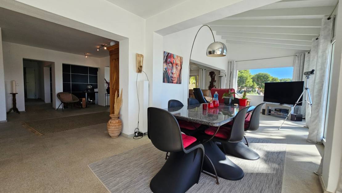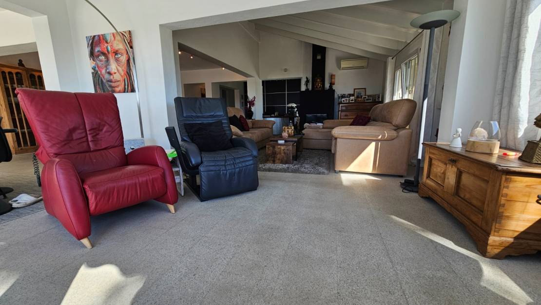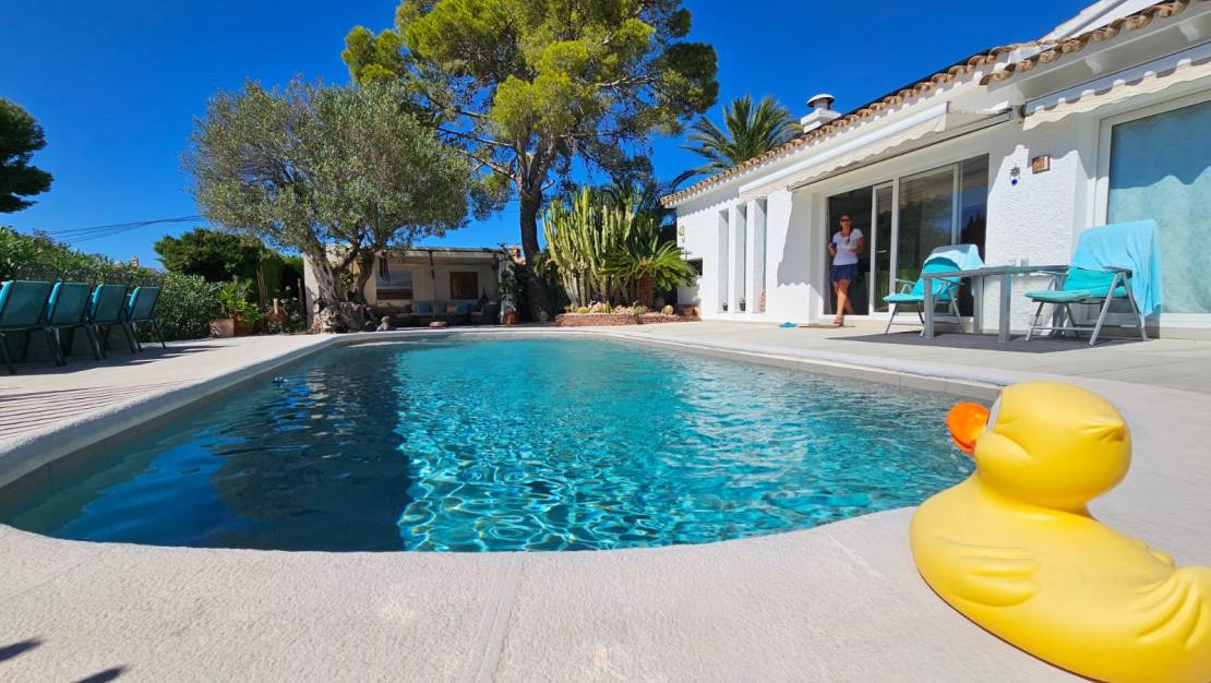 Luxury renovated villa on the San Jaime golfcourse,close to Moraira. This recently renovated villa is located in the picturesque first line of the famous golfcourse in San Jaime,Benissa. With its five bedrooms in total and three bathroooms it is an ideal familyhome. On the groundfloor the villa opens into a spacious and bright living - diningroom with large doors that open to a 9 x 4,5 m swimmingpool and a large terrace with seaviews and views of the Peñon de Ifach.On this terrace we find also a cosy summerkitchen.The modern kitchen adjacent to the livingroom is equipped with quality appliances and finishes. The first floor is dedicated to relaxation and privacy,where also the masterbedroom is located.Here you find a guest WC and the generously big bathroom with a shower and a bath tub which is shared with the double bedroom.Both bedrooms have terrace doors.The villa has solarpanels with a batterystoragesystem.Furthermore we find airconditioning,underfloorheating,double glazing and an irrigationsystem in the garden.The outdoor area is complemented by a barbecue and an ample parkingarea along with a cosy guesthouse.Everything is surrounded by a beautiful and well kept Mediterranean garden. The basement offers various storagerooms.There you can also find the appartment with its open plan kitchen to the livingroom and two single bedrooms,which are sharing one bathroom.