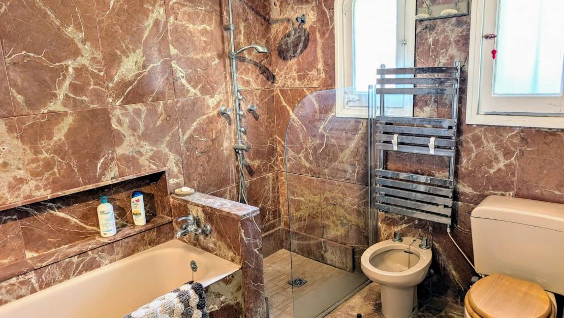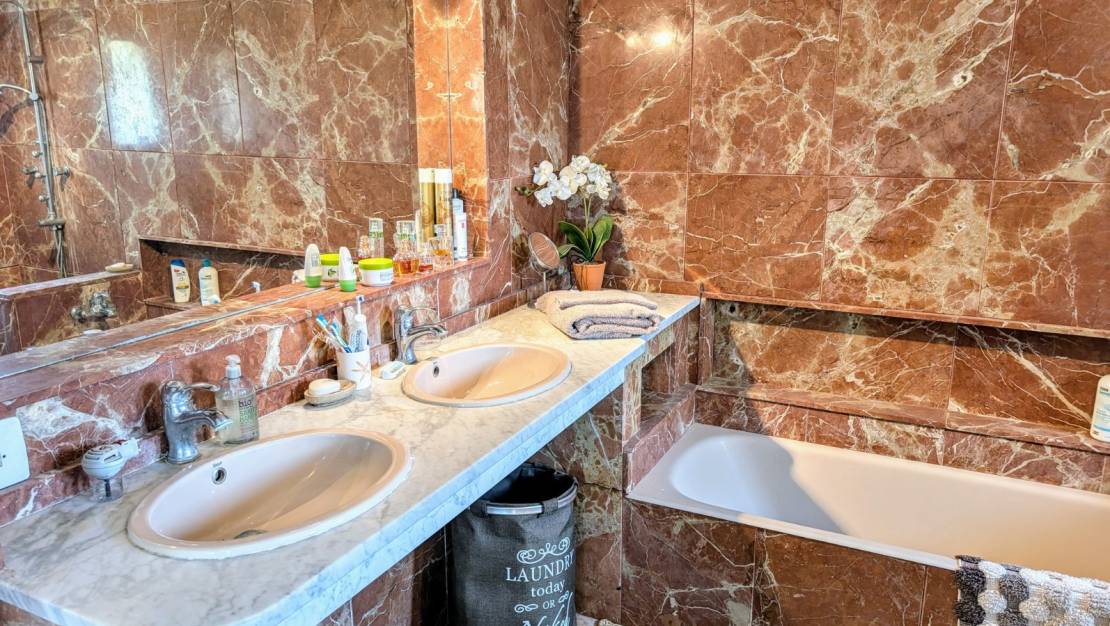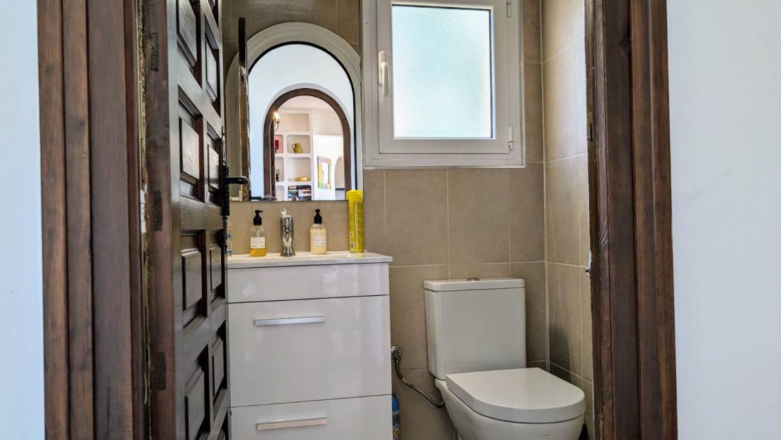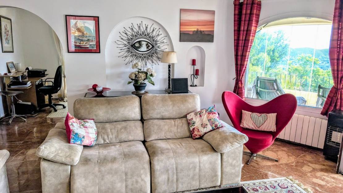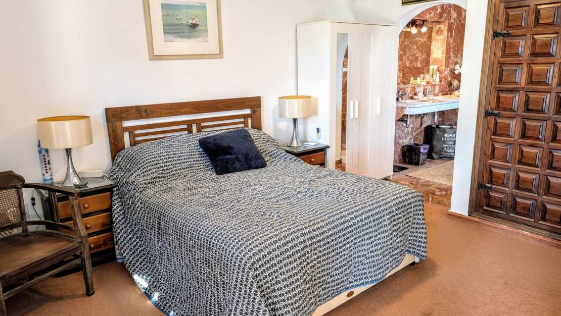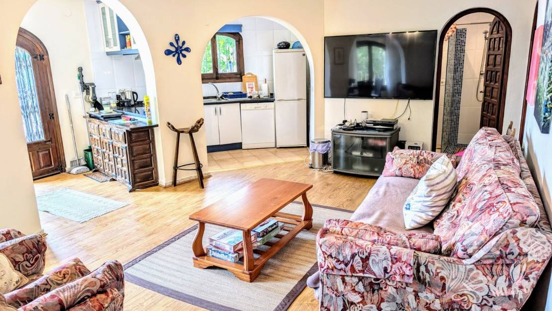 This villa is located in the quiet residential area of Benimeit in Moraira. The property is distributed over two floors with an internal staircase and situated on a large inclining plot. There is parking for two cars outside the vehicle gate and parking for several cars/vehicles outside the villa. From the parking area there is a path and then six steps up the balcony where the front door is located. You enter into the villa into a small hallway which includes the guest toilet, from here you enter into a very large living dining area with feature fireplace, beamed ceiling and many traditional features. To the right through an archway is the kitchen which includes blue and white cupboards and Blue Pearl granite worktops. Appliances include oven, gas hob, extractor, dishwasher and fridge/freezer. Further down the hallway is the back door to the open terraces and the barbecue area, and then you enter the master bedroom, a large room with built-in wardrobes and an archway leading to the spacious en-suite bathroom which has two vanity basins, bath and shower. Through double doors in the living room you enter the semi-circular terrace with glass curtains and wonderful sea and countryside views, a wonderful place to dine or relax. Off to the left of the living room is an office area in the landing at the top of the staircase, at the bottom of the staircase is a lockable door, handy if you wish to separate the two living areas. The ground floor also has a very large living/dining area with an open plan kitchen area, the same design as the kitchen upstairs and including the same appliances. Off the living room there are two large bedrooms with en-suite bathrooms, another double bedroom and a house shower room. One of the bedrooms has access to the house parking area and another has access to an under-build storage area. From the living room there is a door out to the open terrace where you will find a utility room and the staircase down to the pool. The pool terrace has plenty of space for sunbeds and includes a 11 x 3m pool, there us a large lower garden beeath the pool area which has been left natural.- Key points:- Built: 1979- Owners since 2007- Sea and countryside views- Gas central heating- Air conditioning in all of the bedrooms- Wood-burner- Alarm- Internet available- Part double glazed- Some shutters- Furniture included- Annual taxes 1,200€ (property tax and rubbish tax total)- Distances:- Shopping centre 1.9km- Golf 3.4km- Town centre 3.7km- International supermarket and a large choice of restaurants 4km- Motorway access in Benissa 7.5km- If you are looking for a large traditional villa with sea view to renovate in your own style, look no further !!