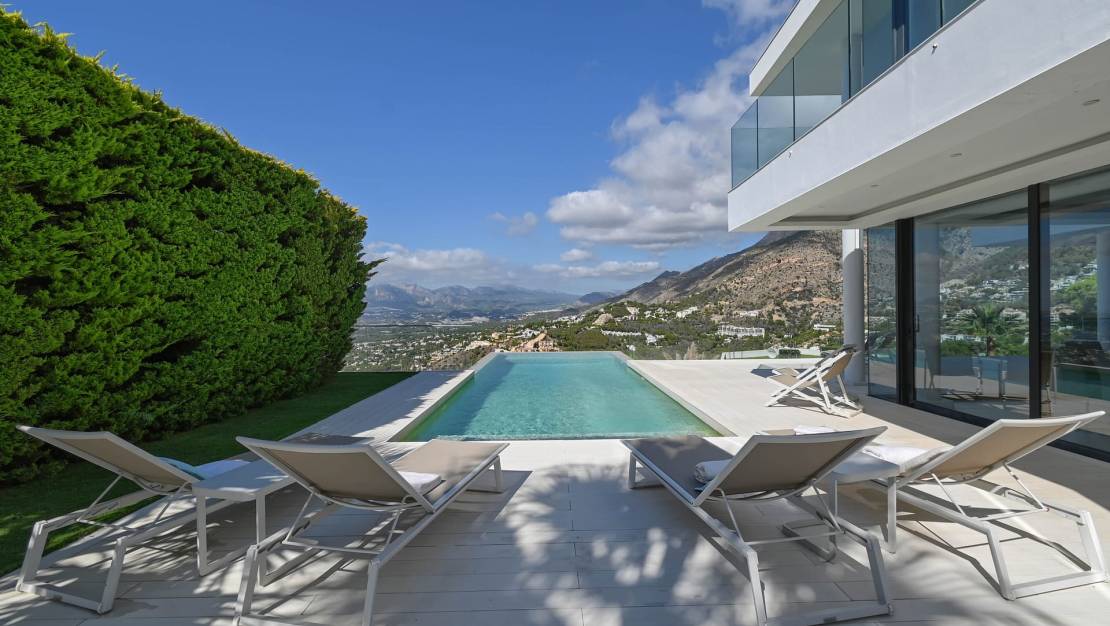 Contemporary Villa with Panoramic Sea Views in Altea Hills This spectacular villa, located in the exclusive gated community of Altea Hills, combines cutting-edge design with the timeless beauty of the Mediterranean landscape. Designed for those who value sophistication, privacy, and lifestyle, it offers panoramic sea and mountain views that set the stage for luxury living on the Costa Blanca. Property Highlights Spanning three levels, the villa offers seamless indoor–outdoor living: Spacious Interiors: Five bedrooms and four bathrooms, including two en-suite suites, provide comfort and privacy for family and guests. Main Floor Living: A double-height living room with gas fireplace, an elegant dining space, and a fully equipped kitchen flow effortlessly onto expansive terraces. Outdoor Lifestyle: Infinity pool, jacuzzi, summer kitchen with grill station, shaded lounges, and sun terraces — all designed to frame the breathtaking views over Altea Hills and the Mediterranean Sea. Upper-Level Retreat: A modern fitness gallery overlooking the coastline and a spectacular master suite with panoramic glazing, custom LED mood lighting, gas fireplace, and private en-suite bathroom. An additional en-suite bedroom with its own balcony completes this level. Lower-Level Comfort: Two spacious bedrooms, a shared bathroom, generous storage, and a double garage ensure practicality without compromise. Rooftop Lounge: Perfect for entertaining or simply enjoying sunset views with complete privacy. Built in 2009 on a 908 m² plot, with 500 m² of living space, southwest orientation, glass façades, and additional exterior parking, this villa epitomises luxury in one of the most prestigious enclaves of the Costa Blanca. Living in Altea & Altea Hills Altea is one of the Costa Blanca’s most desirable destinations, renowned for its whitewashed old town, vibrant cultural scene, and relaxed yet refined atmosphere. The historic cobblestone streets, dotted with boutique shops, art galleries. And authentic Spanish restaurants, contrast beautifully with the contemporary marina lifestyle by the coast. Altea is also celebrated for its gastronomy, with everything from Michelin-starred dining to charming beachfront chiringuitos. And for its rich cultural heritage, with festivals and live music events that run throughout the year. Just minutes away from the old town lies Marina Greenwich (Campomanes Port). The only marina in the world aligned with the Greenwich Meridian (000º 00’ 00’’). Here, luxury yachts, water sports, and fine dining combine to create a true Mediterranean lifestyle hub. Above it all sits Altea Hills, an exclusive gated community with 24-hour security, landscaped grounds. And some of the most impressive villas on the Costa Blanca. Known for its privacy and its elevated position, Altea Hills offers unmatched panoramic views over the sea. And coastline, while still being just a short drive from Altea, Calpe, and easy motorway access to Alicante International Airport. For those seeking both natural beauty and luxury amenities. Altea and Altea Hills stand as premier destinations for international buyers and investors. With prestigious golf courses, wellness retreats, international schools, and top-class infrastructure, this is an area that truly has it all.