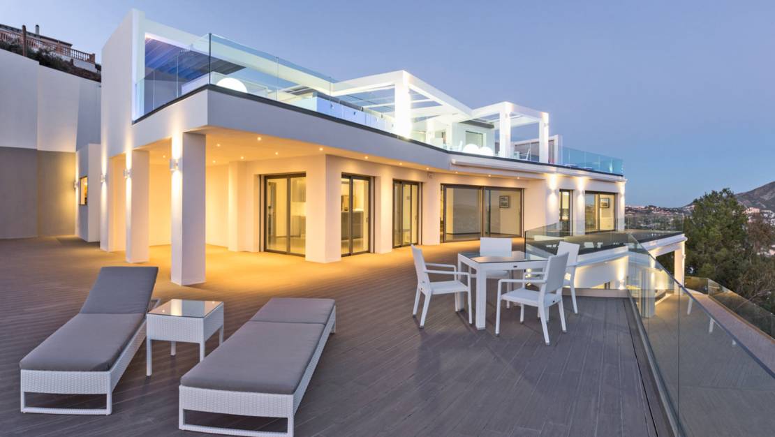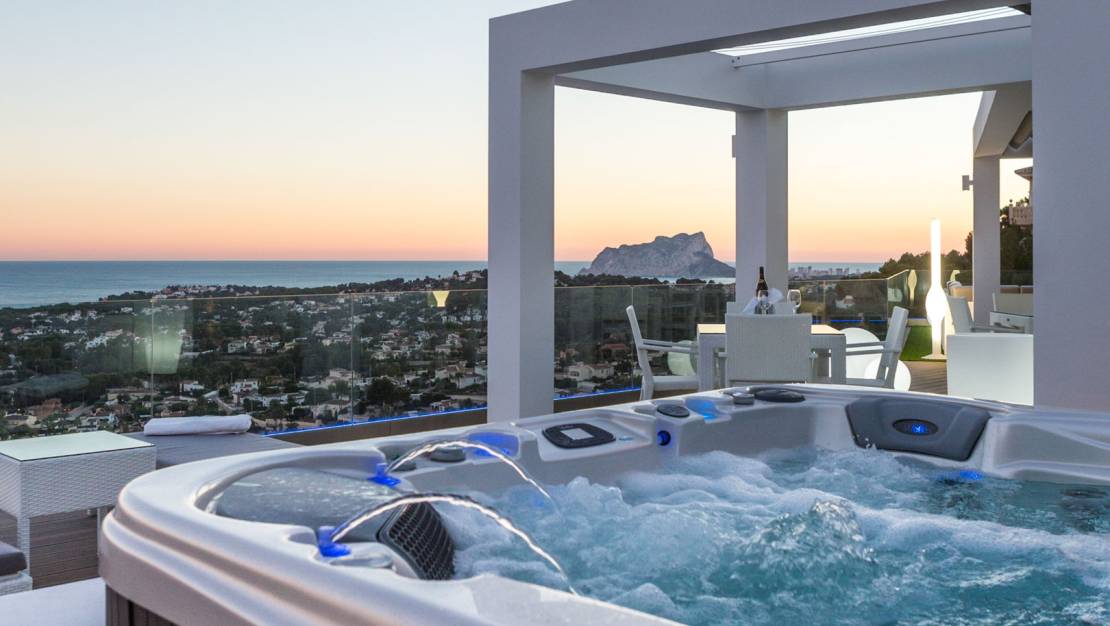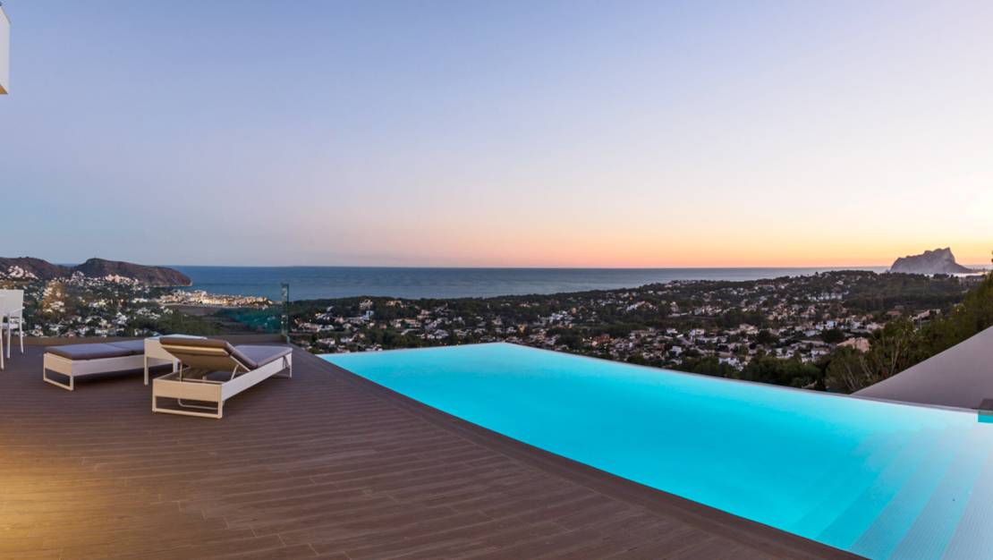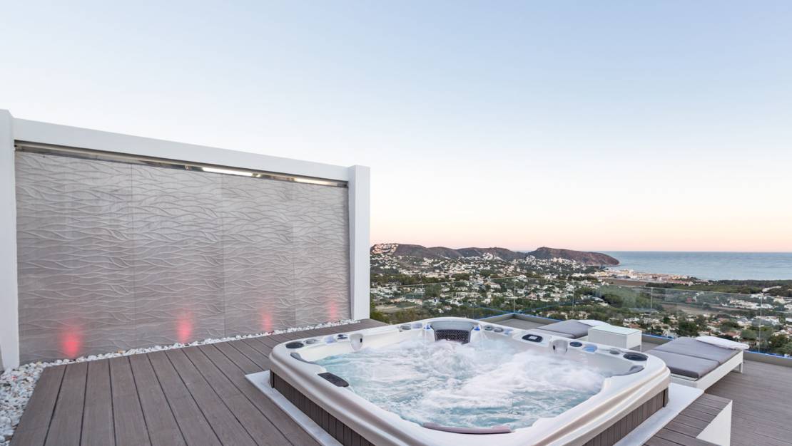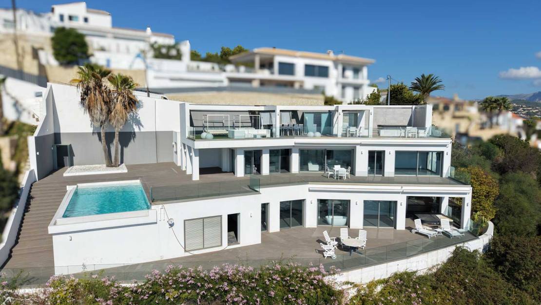 This exclusive modern-style villa stands on a plot of over 900 m², facing south to enjoy all-day sunshine and stunning open views of the Mediterranean Sea. With over 400 m² of living space and 480 m² of terraces, the property perfectly combines contemporary design, comfort, and elegance.The main floor houses a spacious and bright living-dining room with a fireplace, which flows seamlessly into an open and integrated professional kitchen, designed for both everyday use and socializing. From this floor, there is direct access to the spectacular main terrace, where the double-sided infinity pool visually blends with the sea horizon. On this same level, there is an en-suite bedroom with a dressing room, which also enjoys direct access to the terrace and sea views, offering an intimate and serene setting.Downstairs, the villa features three elegant en-suite bedrooms, all opening onto a spacious terrace.This level also houses a spacious open-plan room, ideal as a gym, study, or recreation room, and an exclusive spa area with a glass-enclosed sauna and access to a terrace with an outdoor jacuzzi, creating a perfect space for relaxation and well-being.The rooftop terrace is a true haven of pleasure and relaxation. There, owners can enjoy a hydromassage area, a decorative waterfall, sun loungers, and elegant chill-out furniture, all accompanied by a professional outdoor kitchen with a bar and counter, a guest toilet, and a large shaded area that invites you to enjoy the surroundings in total comfort and privacy.The home is equipped with solar-powered underfloor heating and a heat pump, air conditioning in all rooms, custom-designed interior fittings, a surveillance and alarm system, an electric gate, a garage, and a fully fenced perimeter wall, ensuring maximum security and privacy.Located in Moraira, one of the most exclusive enclaves on the Costa Blanca, this villa is just minutes from the center and its charming coves with crystal-clear waters. Moraira combines the charm of an old fishing village with first-class cuisine, a marina, boutiques, and an unparalleled quality of life. A privileged location where the sea, luxury, and tranquility coexist in perfect harmony.