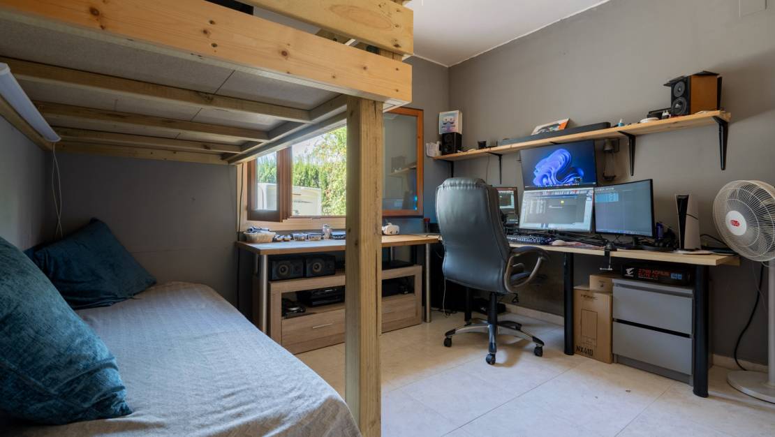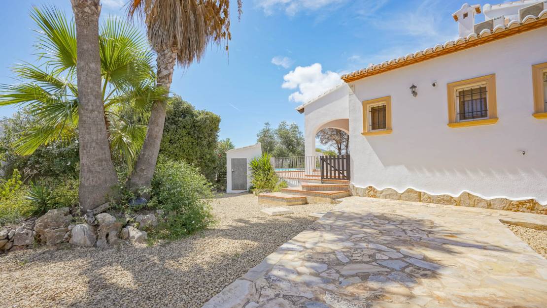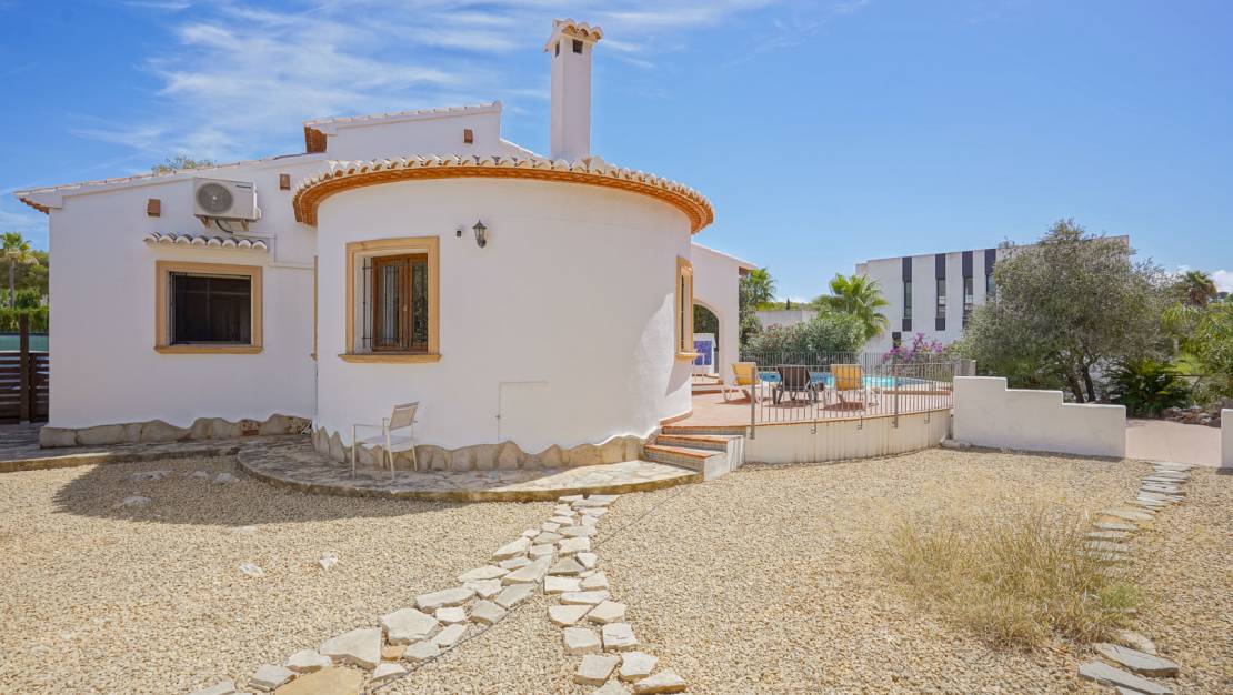 Traditional single-story villa for sale in Balcón al Mar – Portichol, Jávea This charming villa is located in a quiet urbanization, just a stone's throw from some of Jávea's most beautiful coves, including Cala Portichol and Cala Granadella. The property is entirely on one level and features a cozy living-dining room with a fireplace and an adjoining semi-open kitchen. There are three double bedrooms in total, one of which has an en-suite bathroom, plus a separate bathroom. Both the living room and the master bedroom have direct access to a spacious covered terrace by the pool, the perfect place to relax and enjoy the Mediterranean climate. A few steps down is a sunny uncovered terrace with a barbecue. The villa also has a low-maintenance Mediterranean garden with palm trees, flowering shrubs, and a pomegranate tree. Furthermore, the plot offers ample parking space for several vehicles. Additional comfort is provided by air conditioning and built-in wardrobes in the bedrooms. The villa is within walking distance of breathtaking viewpoints and only a 5-minute drive from several idyllic bays. The sandy beach of Jávea can be reached in 10 minutes, and the historic center in 15 minutes. An attractive property in an excellent location, ideal as a vacation home or permanent residence on the Costa Blanca.