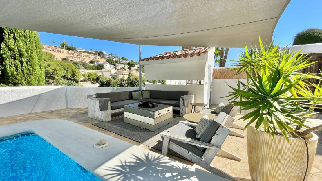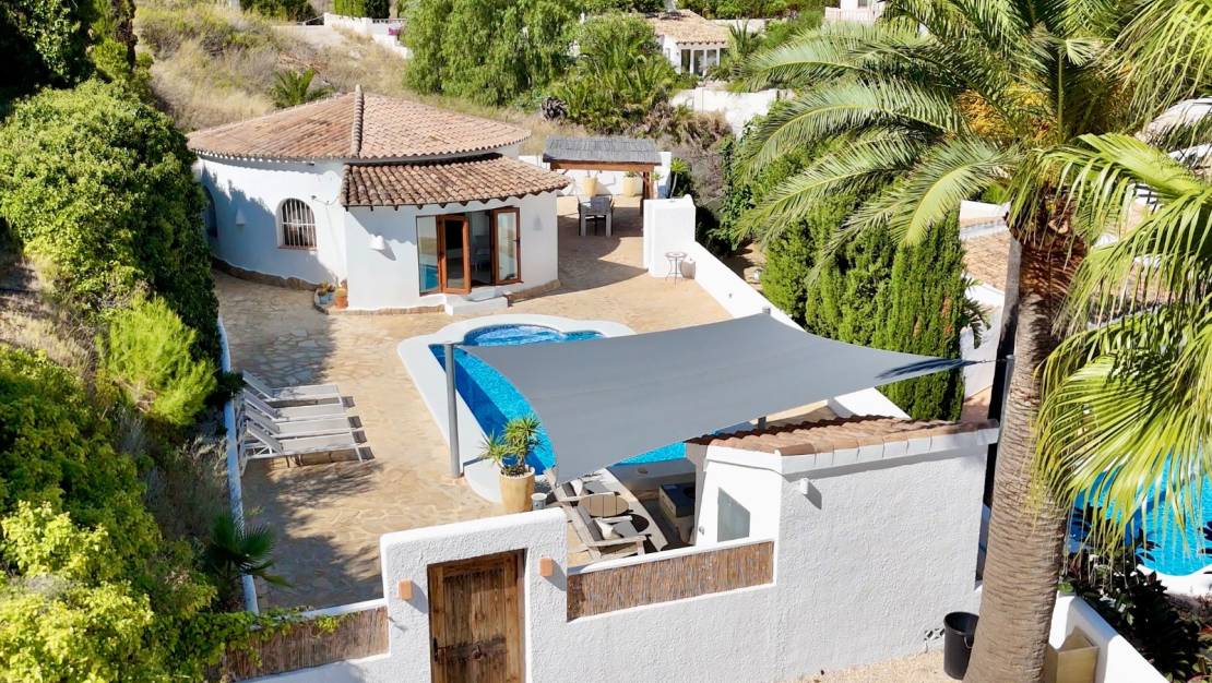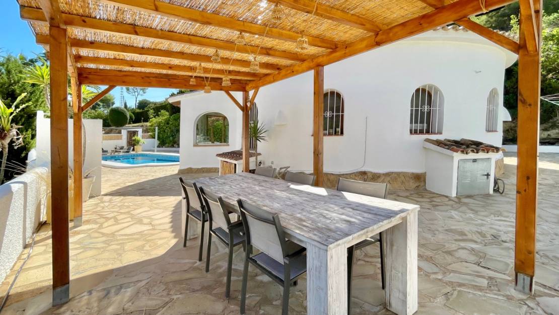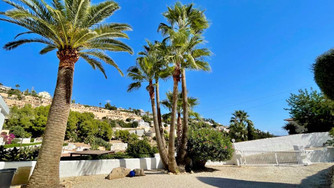 We present this beautiful Mediterranean single-story villa on a flat plot in the quiet and green area of Benimeit in Moraira. Ideal for people looking for an easy-to-maintain home with peace, space, and comfort. The property is located on a spacious and flat plot of 849 m2 on a quiet road with only local traffic, less than an 8-minute drive from Moraira center and the beach. Upon entering the fenced plot, there is ample space to park several cars on site. What immediately stands out are the beautiful mature palm trees that accentuate the Mediterranean atmosphere of the property.