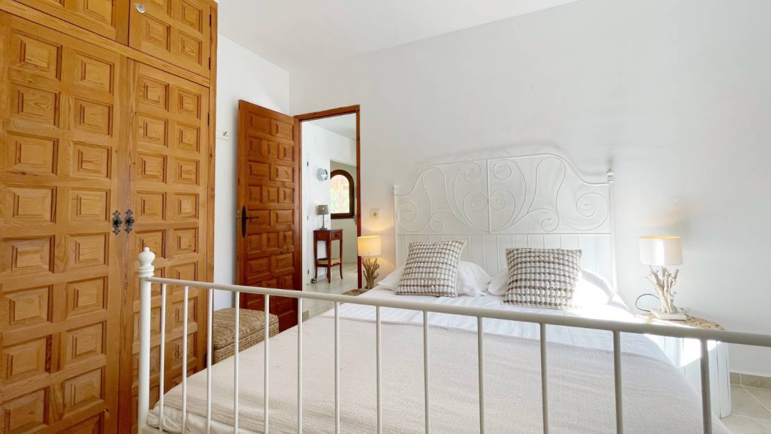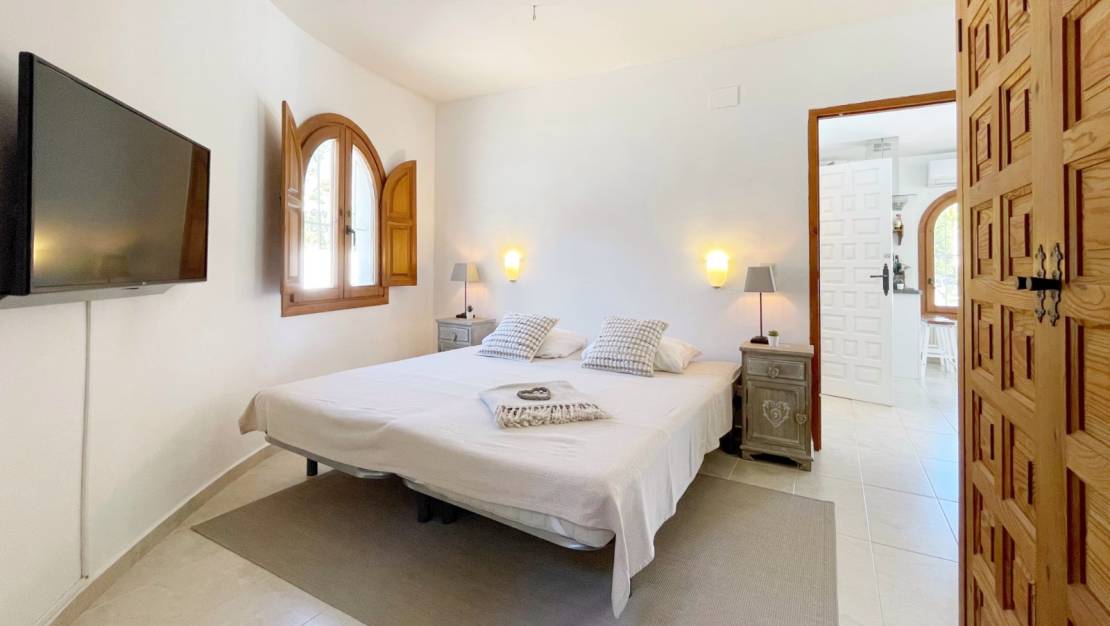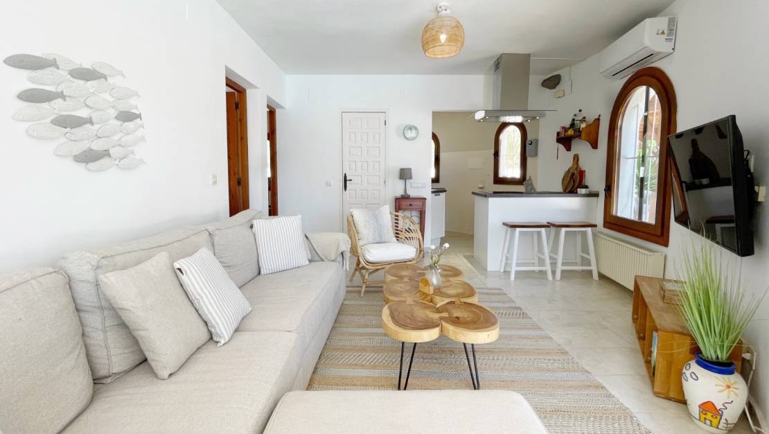 Through a characteristic wooden gate, we enter the spacious pool terrace with a good-sized swimming pool. Here you will also find a cozy lounge area with a shade cloth so you can relax in peace, either in the shade or in the sun. Due to its location, you enjoy complete privacy around the pool terrace. Upon entering the ground floor villa, we arrive in the living-dining room, equipped with recently replaced air conditioning and heating via radiators in each room. Behind it is the open kitchen, equipped with all necessary appliances. On the left are the two bedrooms, which share a modern bathroom with shower, sink, and toilet. The bedrooms feature characteristic elements such as wooden castellano doors, built-in wardrobes, and wooden shutters on the windows. Outside, there is a storage room, an outdoor shower, and a wooden pergola next to the kitchen, perfect for enjoying breakfast outside in the morning or dinner under the stars in the evening.