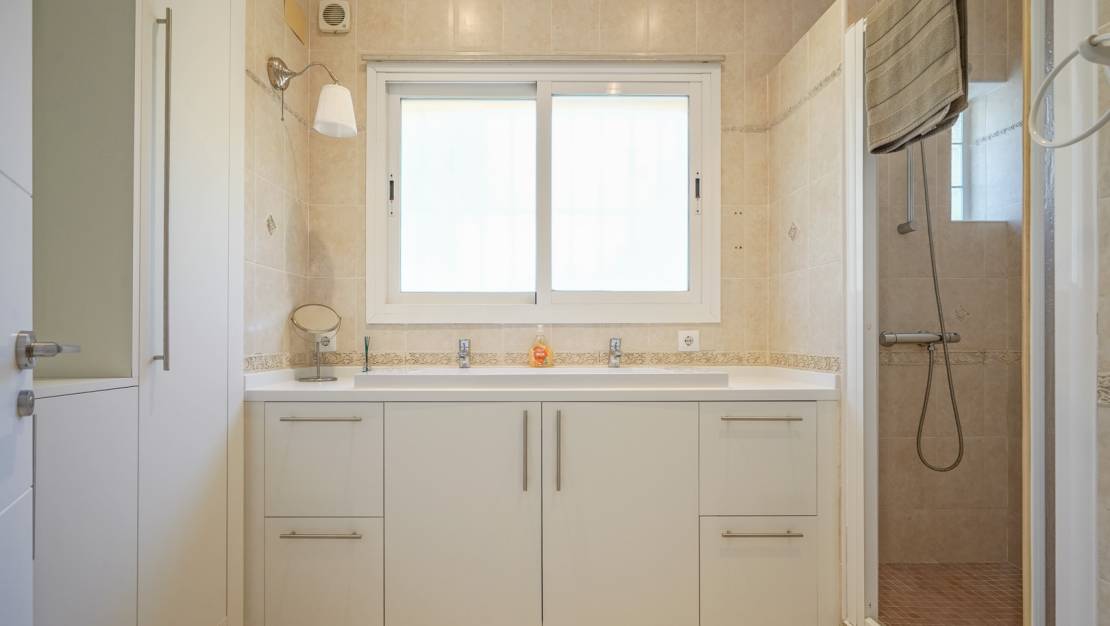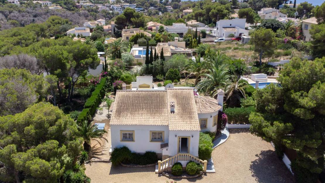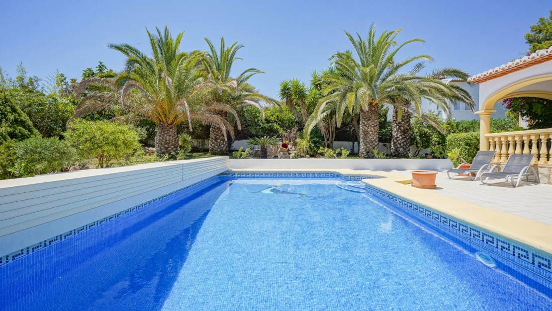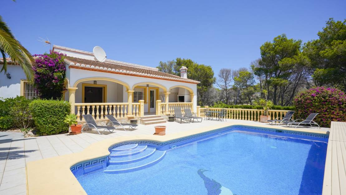 Traditional villa for sale in Costa Nova, JáveaThis charming traditional villa is located in the quiet Costa Nova-Ambolo area, just a few hundred metres from the coast. The property is single-storey and offers a convenient layout. Upon entering, you enter an entrance hall with built-in cupboards, from where you have direct access to the spacious kitchen. Adjacent is the living-dining room, which is bathed in natural light thanks to the many windows.On the left side of the villa is the master bedroom with an en suite bathroom, while two additional, spacious bedrooms share a second bathroom. Both the living room and the master bedroom open onto a covered terrace with an outdoor kitchen. This terrace overlooks a large private pool surrounded by a lush Mediterranean garden, ensuring complete privacy. Moreover, thanks to the south-facing orientation of the villa and the pool, you will enjoy all-day sunshine and optimal light. There is ample parking on the plot and the villa is equipped with central heating via radiators, making the house comfortable even in the cooler months. The location is ideal: just a few minutes' drive from beautiful beaches such as Cala Granadella and Portichol.