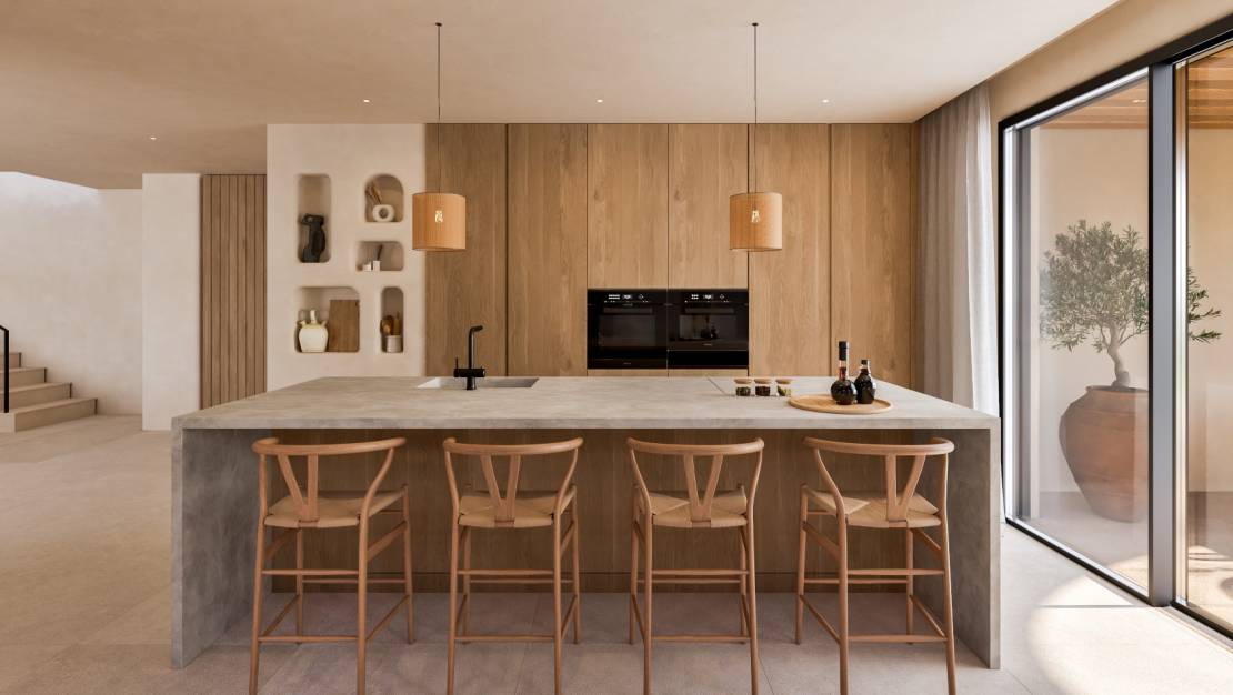 These unique homes combine contemporary architecture with Mediterranean warmth: spacious terraces, private pools, stone details, wooden pergolas, arches in the nayas and lush gardens create an atmosphere of refined serenity. Inside, the open and bright spaces naturally integrate with the outdoors, where the sea breeze and sunsets become part of everyday life.