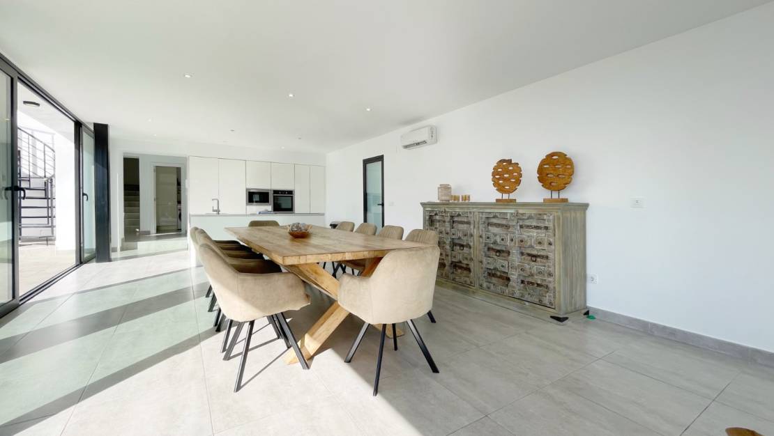 An internal staircase leads to the ground floor, where we find another spacious bedroom with an en-suite bathroom. The bright living and dining room is the centerpiece of the house, with large windows connecting the indoor and outdoor living areas. The modern open-plan kitchen with cooking island is practically designed and fully equipped. On this floor, you will also find a separate laundry room, an additional bathroom and a multifunctional room that can be used as a relaxation room, office, etc.
