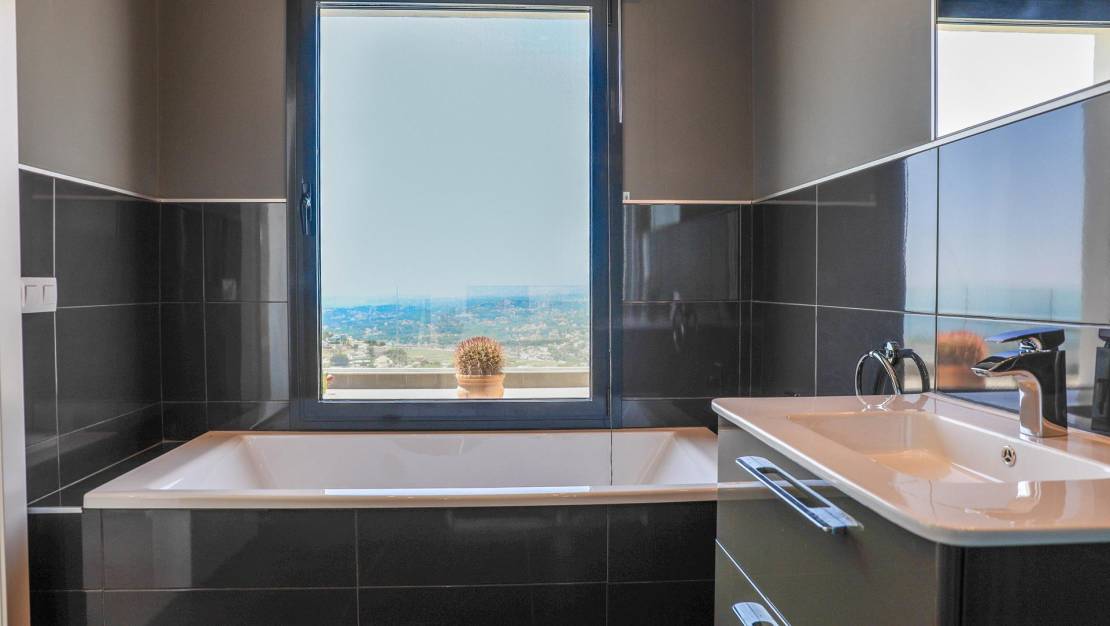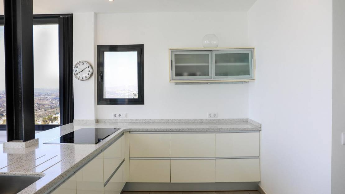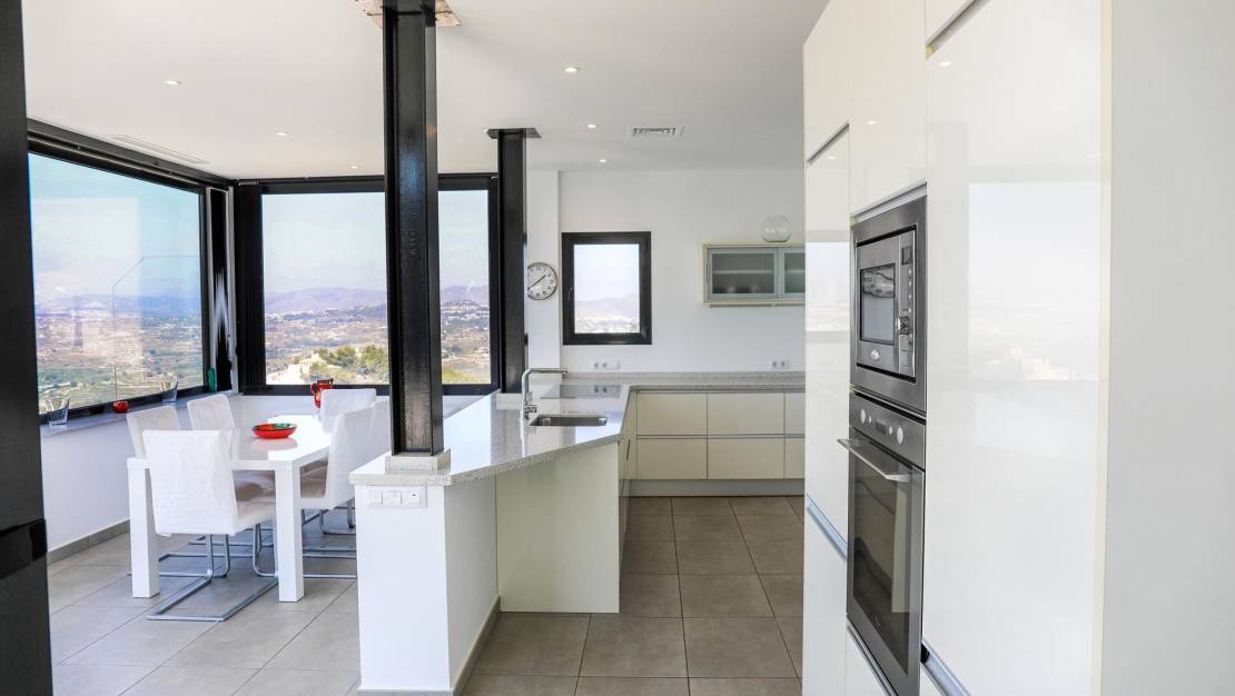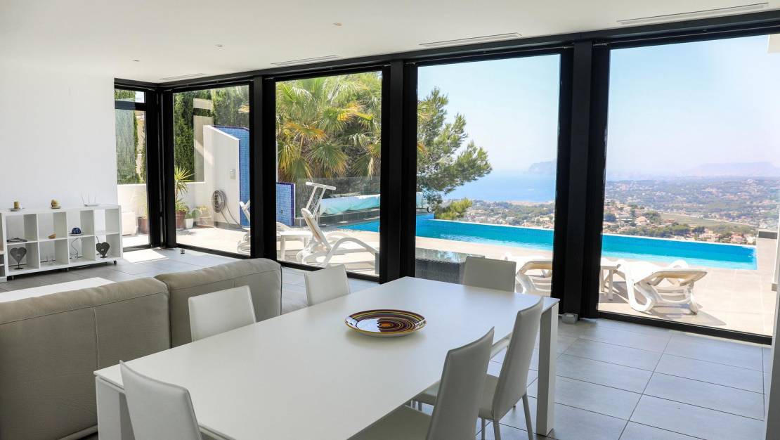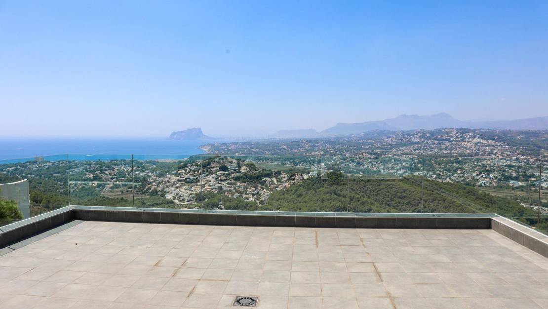 Modern style villa with stunning sea views in the Kalmias residential area of ​​the Cumbre del Sol urbanization located between Jávea and Moraira. It has a total constructed area of ​​430 m2 (200 m2 of main house, 90 m2 of guest apartment and 140 m2 of terraces), all built on a plot of 1025 m2. In total we have 5 double bedrooms all with their private bathroom. Likewise, the villa is equipped with underfloor heating and air conditioning throughout the house. The villa is built on several levels. We access with the car through a wide and comfortable access ramp, accessing the parking area with a covered area and with access to the villa through the upper floor, on the upper floor we have three double bedrooms each with its own bathroom. bathroom and direct access to the outdoor terrace with spectacular views of the sea and the mountains. Through an internal staircase we go down to the main floor of the villa where we have the living room and kitchen in open concept as well as the laundry room and a courtesy toilet, both from the kitchen area and the living room we can access the terrace exterior with private pool. From the terrace we can access the barbecue area that is located on one side of the villa. From this terrace we can skirt the pool and reach the guest apartment which is also accessible via an external staircase directly from the parking area of ​​the villa. The guest apartment enjoys very nice views from the outside terrace and the living room. Through an internal staircase we go up half a floor to access the two double bedrooms and the two bathrooms.  The Kalmias residential area is a development of villas consisting of 189 plots of 750 to 1200M2 located in the cumbre del sol urbanization in Benitachell (Alicante). Almost all the plots enjoy beautiful views of the sea, the Moraira valley with Calpe in the background and the mountains with the Sierra de Bernia in the background, the orientation of the plots can be South and Southwest. Residencial Kalmias is located in the Cumbre del sol urbanization at the south entrance bordering the Jazmines y Lirios residential area. Distances to services: From 1 to 3 km you will find the Dreamsea Mediterranean camp with a bar and restaurant and access to Morach beach, the cala de los tiestos and Cala Llebeig, the Lady Elisabeth international school, the Mercadona supermarket and the equestrian. From 4 to 5 km; the Adelfas shopping center with the Pepe la sal supermarket, hairdresser, maintenance and rental services agency, cafeteria bar, la cumbre restaurant, pharmacy, sports center with paddle tennis, tennis, bar, Mas y Mas supermarket and the center urban Benitachell From 6 to 7 km; the urban center and the beach of Portet de Moraira and the golf course of Jávea. 12 km away is the sandy beach of Jávea