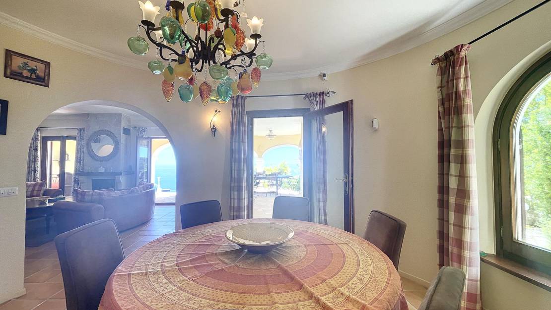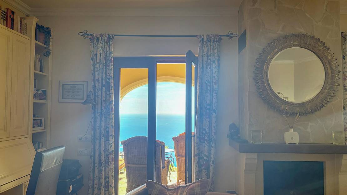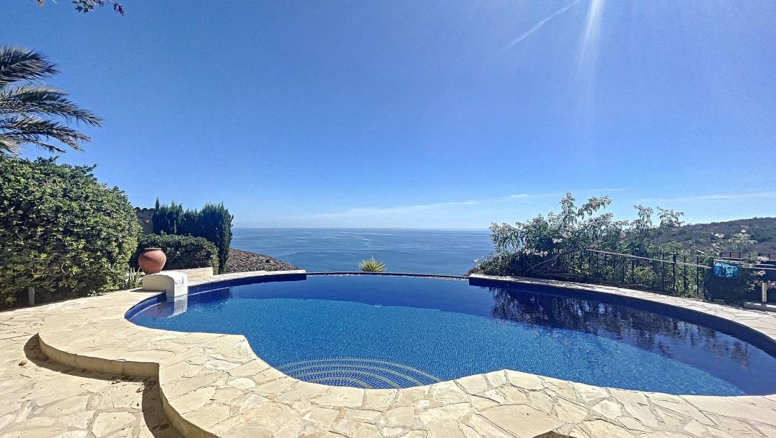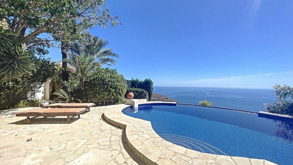 Refurbished Mediterranean style villa on the seafront with spectacular views located in the Fresnos residential area of Cumbre del Sol, Benitachell (between Jávea and Moraira).  The property has a total built area of 455 M2 (260 M2 living area, 160 m2 terraces and 35 M2 garage) on a plot of 889 M2. The villa has four double bedrooms, three bathrooms, a study, a dressing room, living room, separate lounge, two kitchens and several open and covered terraces, as well as a garage and storage rooms. The villa is built on two floors, on the ground floor we have two double bedrooms, kitchen, living dining room with fireplace and the exit to the covered terrace with access to the outside terrace with the private pool.   An internal staircase leads up to the first floor where we find the master bedroom with en-suite bathroom and a huge dressing room, as well as the exit to an outside terrace and the access to the guest apartement which is also accessible via a separate external staircase.   The guest flat consists of a double bedroom, bathroom and living room with kitchen from which we can access another outdoor terrace and access through it to the studio which is also accessible from the terrace of the master bedroom.  The whole villa is surrounded by a beautiful garden and the plot borders a green area overlooking the cliffs of Cumbre del Sol.  El Residencial Fresnos is a property development located in the urbanization Cumbre del Sol in Benitachell (Alicante). Most of the properties are oriented to the south or southeast and in some of them we have views of the sea. The common areas consist of a large lagoon pool, terraces, social club and garden. El Residencial Fresnos adjoins the Granadella Natural Park (Jávea) and the sports area with paddle tennis courts, tennis courts and a bar Distances to services: Less than 500 meters away is the Adelfas shopping center with the Pepe la sal supermarket, hairdresser, maintenance and rental service agency, cafeteria-bar, la cumbre restaurant and pharmacy. From 1 to 2 km; the access to Morach beach and the cove of Los tiestos, Lady Elisabeth international school and horse riding. From 4 to 6 km; Mercadona supermarket and Mas y Mas supermarket. From 9 to 12Km; The arenal beach of Jávea, the Moraira beach and the Portet de Moraira beach.