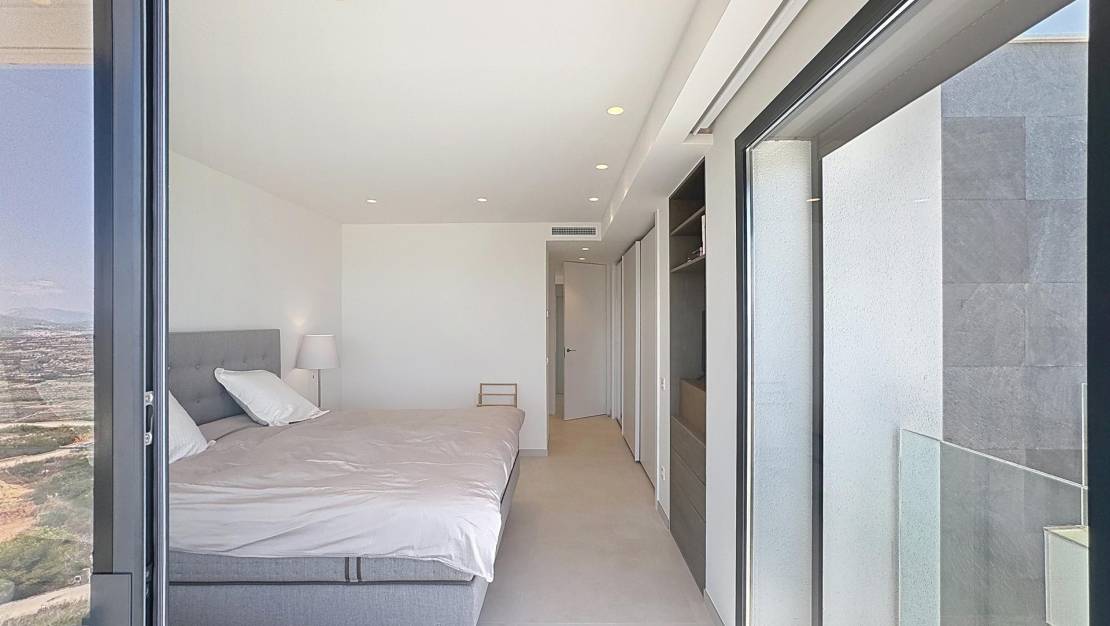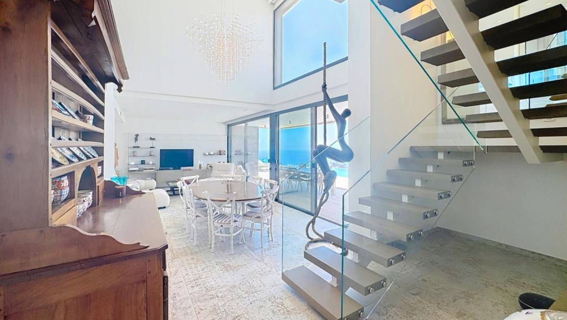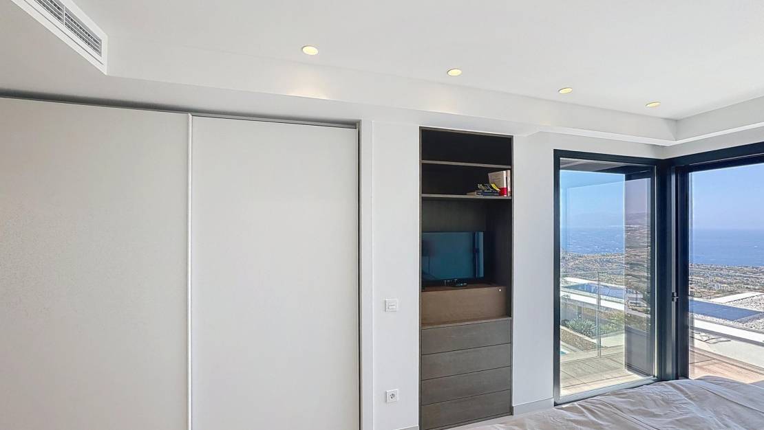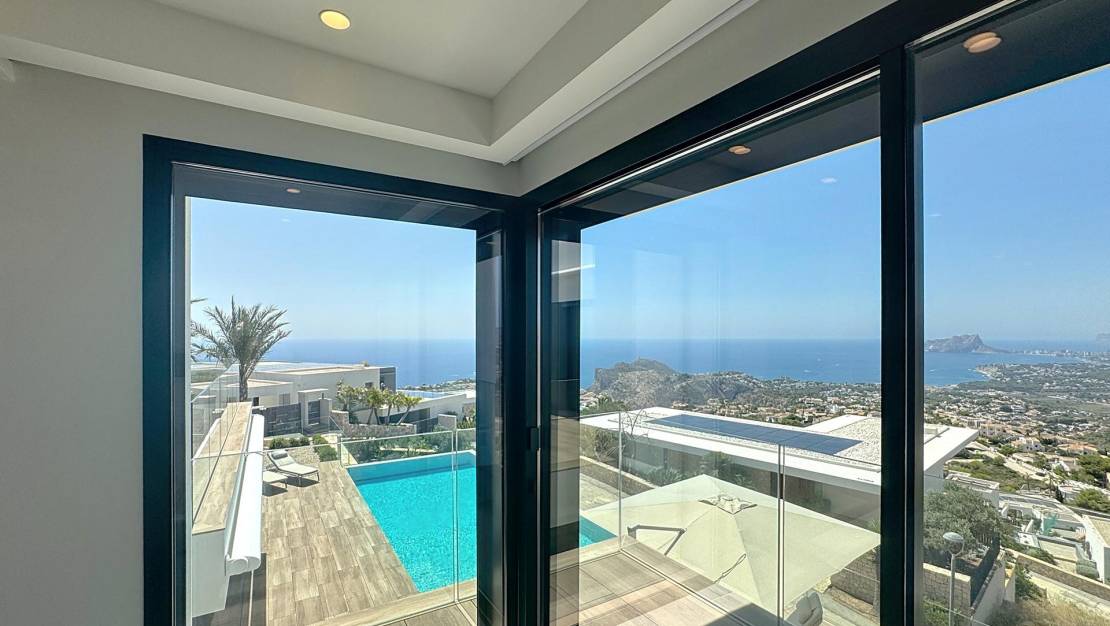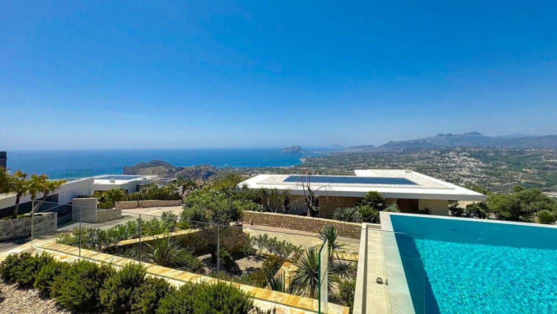 Luxury villa with panoramic sea views in the exclusive Jazmines area, Cumbre del SolContemporary design, maximum privacy and unparalleled viewsThis stunning luxury villa is located in one of the most privileged locations on the northern Costa Blanca: the Jazmines residential area, within the prestigious Cumbre del Sol development, between Moraira and Jávea, in the municipality of Benitachell. A unique enclave where cutting-edge architectural design blends with spectacular natural surroundings. The property stands out for its spectacular panoramic views of the Mediterranean Sea, stretching from the coast of Moraira and Benissa to the imposing Peñón de Ifach in Calpe, passing through the majestic Sierra de Bernia, all framed by the deep blue sea. An exclusive property distributed over three floorsWith a total built area of 544 m² on a 940 m² corner plot, this villa offers 5 double bedrooms, all with en-suite bathrooms, as well as spacious terraces, open-plan living areas and multiple outdoor spaces designed for year-round enjoyment. Entrance floor: functionality and stunning viewsThe property is accessed via an elegant entrance hall leading to the covered garage (46 m²), a utility room with laundry, and the main entrance to the property. From here, there is a spectacular open-plan area with a double-height living room and a huge panoramic window with sea views. On this same level, there are three double bedrooms, all with fitted wardrobes, en-suite bathrooms and access to terraces with views. The master bedroom also has an elegant dressing room and access to a private terrace. Ground floor: open spaces, light and connection to the outsideDescending a very comfortable internal staircase, we arrive at an area that impresses with its spaciousness and brightness. A double-height living-dining room features an 8-metre window that frames the sea as if it were a painting. The modern, fully equipped kitchen with a separate pantry opens onto the outdoor terrace. This floor also has a guest toilet. The kitchen and living room lead to the main terrace, where you will find the private swimming pool, the Mediterranean garden and a barbecue area with a summer kitchen, ideal for enjoying the climate and views all year round. Basement: guest apartment with independent accessAn external staircase leads to the guest apartment, comprising two double bedrooms, two full bathrooms, ducted air conditioning and a private covered terrace with spectacular views of the natural surroundings and the sea. Premium fittings and finishesEvery detail of this property has been carefully selected to ensure maximum comfort and efficiency: Underfloor heating and ducted air conditioningHome automation system, alarm and high-quality finishes15Kw photovoltaic installationSwimming pool with motorised coverOutdoor summer kitchen and landscaped areasThis villa not only offers a luxury experience, but also sustainability and energy efficiency. Would you like to live in a villa like this?If you are looking for an exclusive residence on the northern Costa Blanca, with privacy, contemporary design and unparalleled views, this property in the Jazmines area is for you. Contact us today and discover why so many people have chosen Cumbre del Sol to live or invest with complete peace of mind. Jazmines Residential Area – Cumbre del SolThe Jazmines area is one of the most exclusive within Cumbre del Sol, a well-established, peaceful environment that is highly valued by international buyers. It is located at the southern entrance of the development, which provides excellent connectivity to Moraira and Jávea. Its main attributes include: Privileged views of Ibiza, La Granadella, El Portet, the Peñón de Ifach and the Sierra de BerniaSpacious plots of between 800 m² and 1,200 m², with maximum privacyModern architectural design with high-end finishesUnrivalled natural surroundings, surrounded by sea and mountainsProximity to coves, high-quality services and leisure areasLiving in Jazmines is synonymous with well-being, exclusivity and quality of life. Here you are not just buying a house, you are buying a way of life.