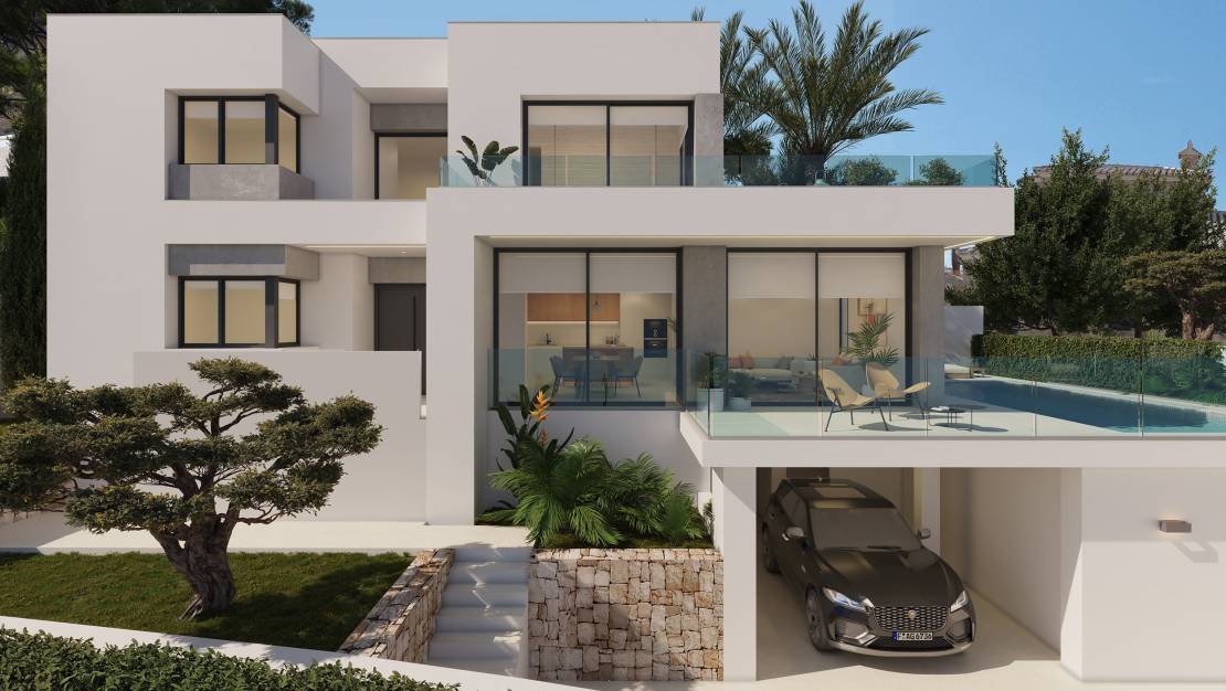 Villa Bianca, situated on plot 74 of Residencial Magnolias in Cumbre del Sol, stands out for its contemporary architecture, spacious interiors, and orientation towards the Mediterranean Sea. This exclusive development combines modern design, practicality, and sweeping horizon views, providing a lifestyle full of comfort and elegance. Villa Bianca is built on two floors and a basement. The main floor is the heart of the house: an open space where the kitchen, dining area, and living room merge, all with direct access to the terrace and infinity pool. This level also includes an en-suite bedroom and a guest WC. Upstairs are two generous bedrooms with en-suite bathrooms and access to a large private terrace, perfect for enjoying the weather and the views. The basement offers over 80 m² of open space, complete with a private terrace, and can be configured as a guest bedroom, gym, office, or any other space the future owner may require. The interior design has been carefully planned, using a palette of natural materials like wood, stone, and neutral colours that add warmth to the spaces. The kitchen stands out for its practicality and modern look, featuring top-brand appliances and a central island with a breakfast bar. The dining and living areas, filled with natural light thanks to large windows, are connected to the outside through decor that prioritises comfort without sacrificing elegance. Outside, the infinity pool becomes the focal point of outdoor life, with lounging areas, outdoor dining, and a garden terrace overlooking the sea. The entire project has been designed to be functional, efficient, and aesthetically pleasing, with particular attention to detail and finishes.