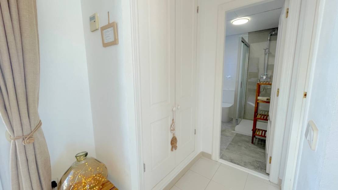 From the beautifully maintained communal walkway that borders the lush shared gardens, a short flight of stairs leads up to a welcoming, private, sun-drenched terrace where you’ll enjoy amazing sunsets and rural views, with even some sea glimpses. From here, you enter the bright lounge–dining area, which connects seamlessly to the open-plan kitchen, creating an inviting and functional central living space. From this lounge area, you also have direct access to a charming covered terrace overlooking the tranquil communal gardens—an ideal spot to relax, unwind, and enjoy the peaceful surroundings in complete comfort.