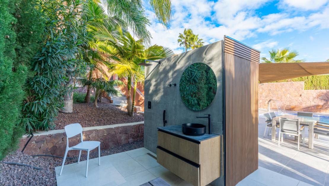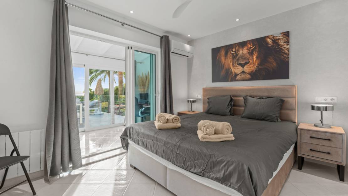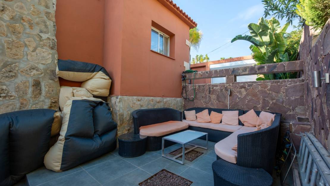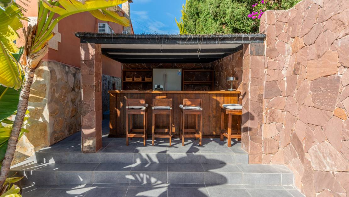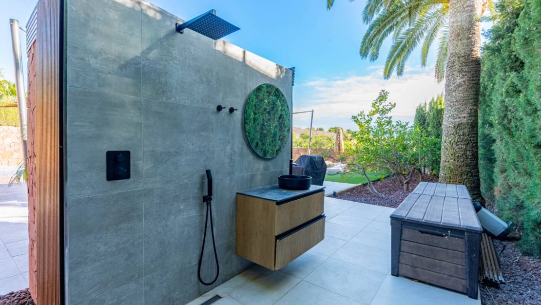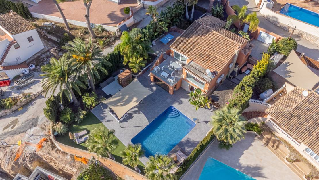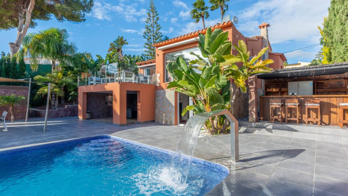 The villa welcomes you through a sunny terrace on the main floor. You enter a bright living room with large windows that beautifully frame the view of Moraira and the green garden. The built-in wood-burning stove and the thoughtfully placed work corner create a warm and practical living space. The separate kitchen is fully equipped and has all the amenities you could wish for. This floor also has two comfortable bedrooms with built-in wardrobes and two modern bathrooms with showers. The living room leads directly to a spacious terrace with an electric awning. A few steps down is a second terrace, a pleasant shaded area with space for relaxation and recreation, surrounded by Mediterranean plants. On the lower level, this villa has a completely independent guest suite. It has a private entrance from the pool terrace, its own sitting area, sleeping area and bathroom. Ideal when you want to receive guests without compromising on peace and privacy. In the garden, the modern rectangular swimming pool, recently renovated, forms the heart of the garden. Here you will find various lounge areas, an outdoor shower and a spacious seating area with television: perfect for long evenings outside. On the other side of the garden is an attractive covered bar, fully equipped to comfortably entertain friends and family.