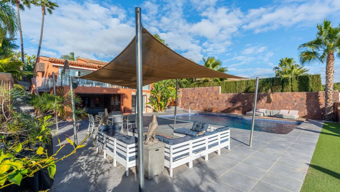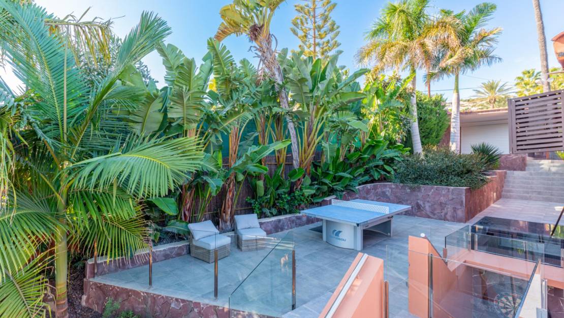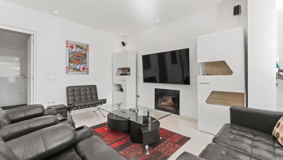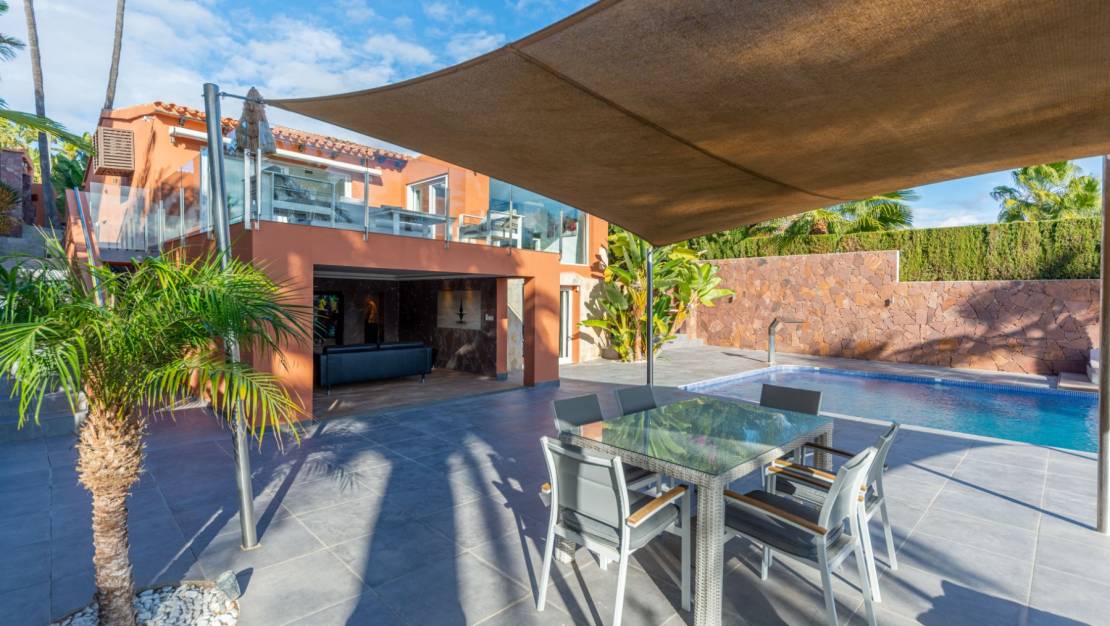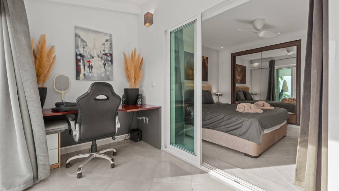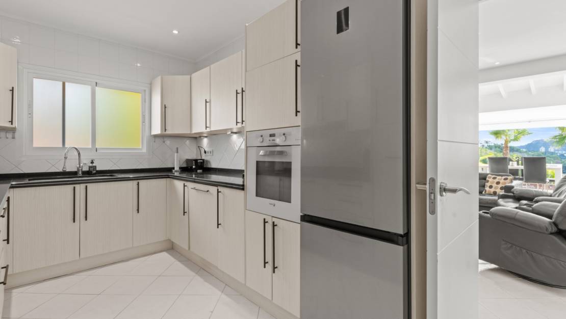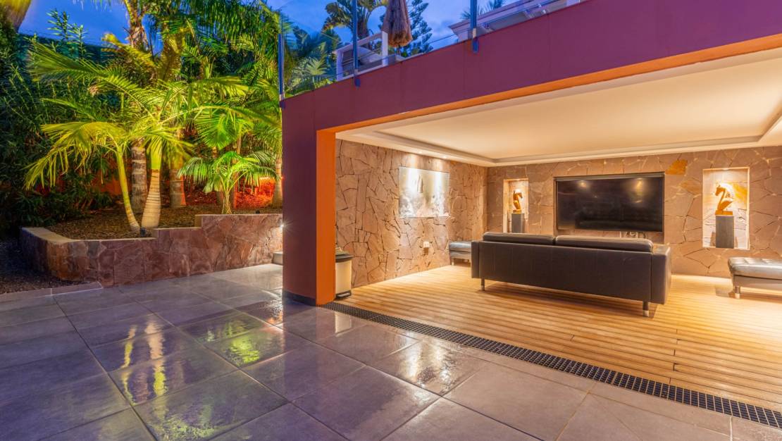 The villa welcomes you through a sunny terrace on the main floor. You enter a bright living room with large windows that beautifully frame the view of Moraira and the green garden. The built-in wood-burning stove and the thoughtfully placed work corner create a warm and practical living space. The separate kitchen is fully equipped and has all the amenities you could wish for. This floor also has two comfortable bedrooms with built-in wardrobes and two modern bathrooms with showers. The living room leads directly to a spacious terrace with an electric awning. A few steps down is a second terrace, a pleasant shaded area with space for relaxation and recreation, surrounded by Mediterranean plants. On the lower level, this villa has a completely independent guest suite. It has a private entrance from the pool terrace, its own sitting area, sleeping area and bathroom. Ideal when you want to receive guests without compromising on peace and privacy. In the garden, the modern rectangular swimming pool, recently renovated, forms the heart of the garden. Here you will find various lounge areas, an outdoor shower and a spacious seating area with television: perfect for long evenings outside. On the other side of the garden is an attractive covered bar, fully equipped to comfortably entertain friends and family.