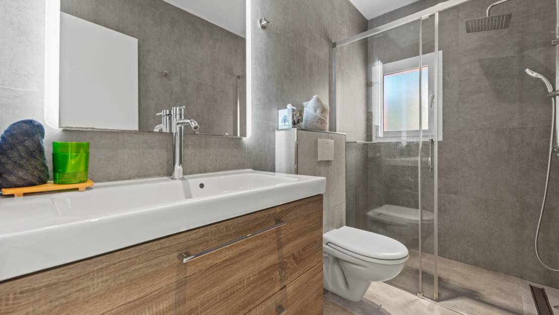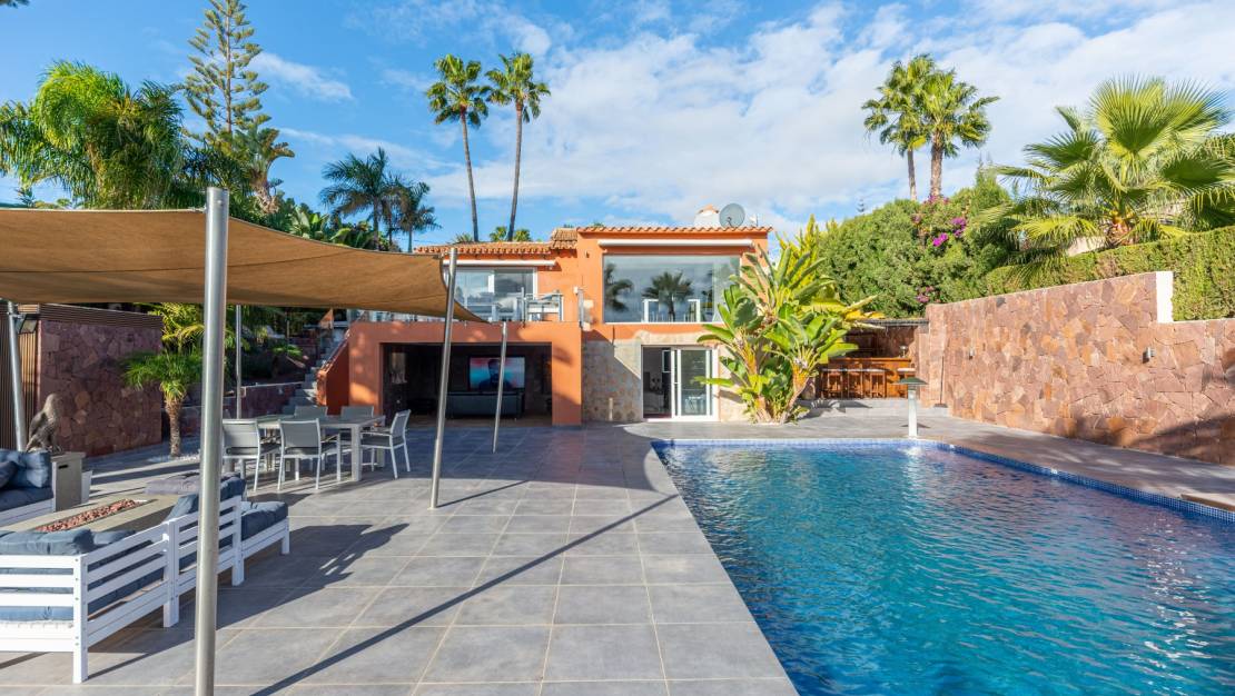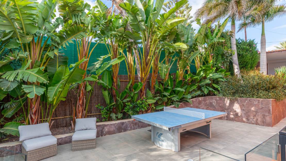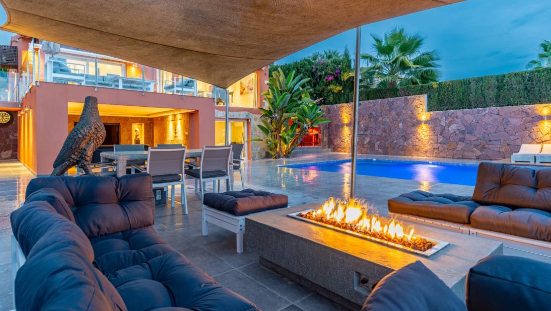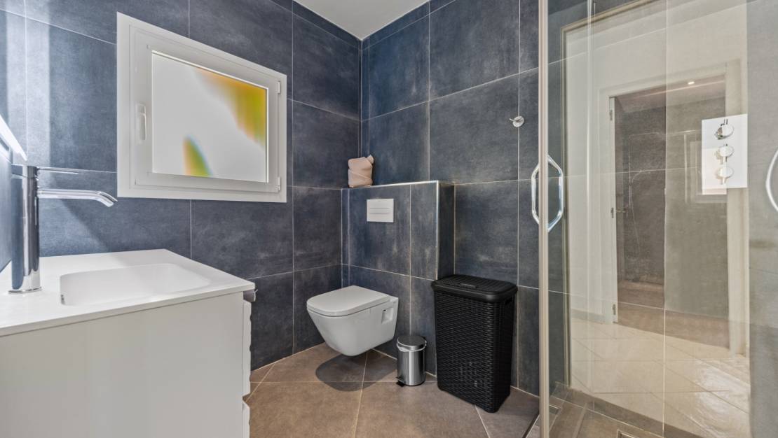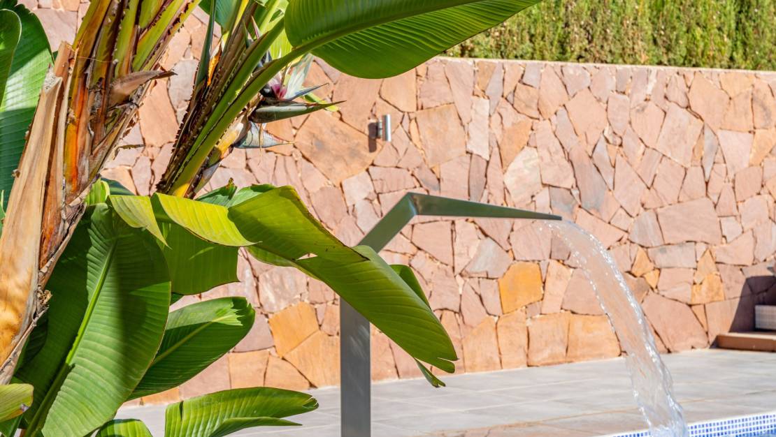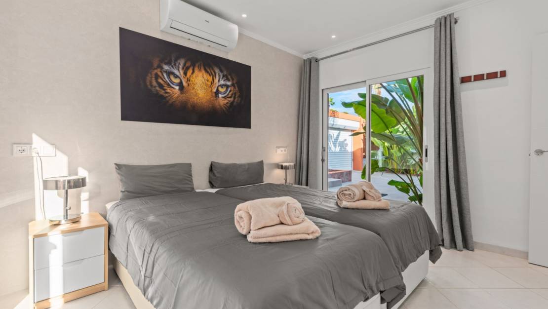 The villa welcomes you through a sunny terrace on the main floor. You enter a bright living room with large windows that beautifully frame the view of Moraira and the green garden. The built-in wood-burning stove and the thoughtfully placed work corner create a warm and practical living space. The separate kitchen is fully equipped and has all the amenities you could wish for. This floor also has two comfortable bedrooms with built-in wardrobes and two modern bathrooms with showers. The living room leads directly to a spacious terrace with an electric awning. A few steps down is a second terrace, a pleasant shaded area with space for relaxation and recreation, surrounded by Mediterranean plants. On the lower level, this villa has a completely independent guest suite. It has a private entrance from the pool terrace, its own sitting area, sleeping area and bathroom. Ideal when you want to receive guests without compromising on peace and privacy. In the garden, the modern rectangular swimming pool, recently renovated, forms the heart of the garden. Here you will find various lounge areas, an outdoor shower and a spacious seating area with television: perfect for long evenings outside. On the other side of the garden is an attractive covered bar, fully equipped to comfortably entertain friends and family.