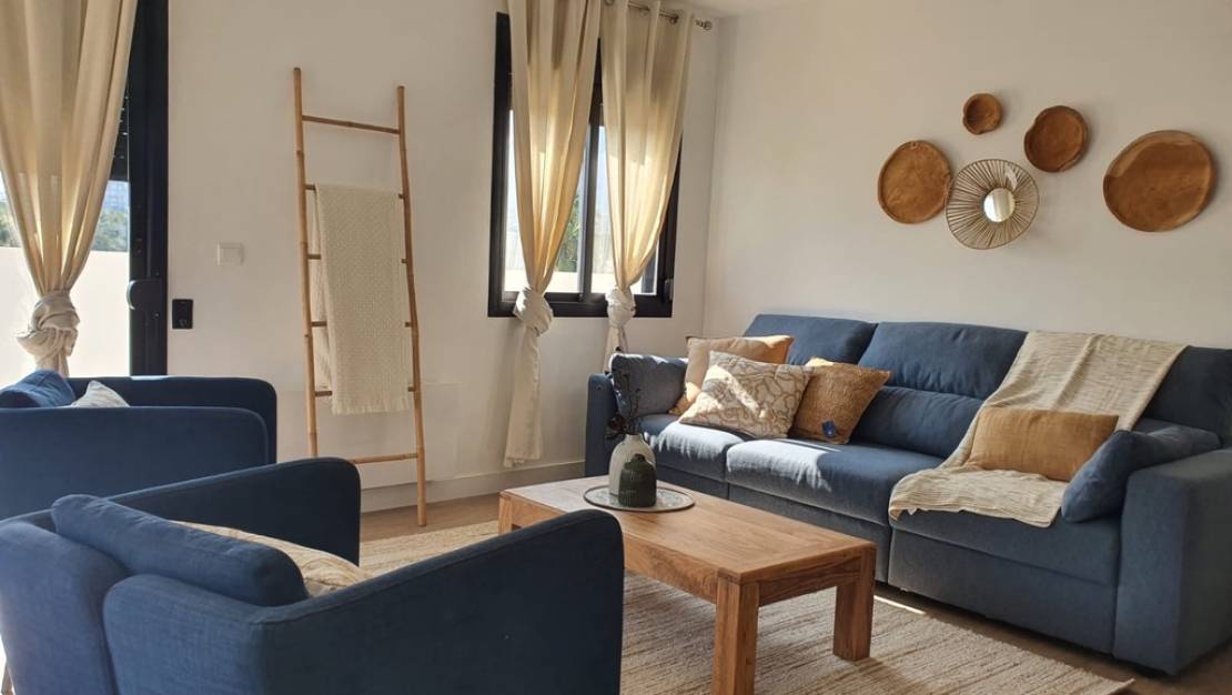 The living room is spacious and open-plan, seamlessly integrated with the kitchen, creating a modern and functional space perfect for everyday living and entertaining. From various points in the apartment, you can enjoy unobstructed views of Montgó mountain and glimpses of the sea.