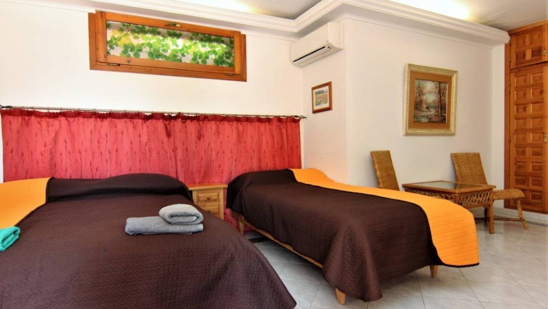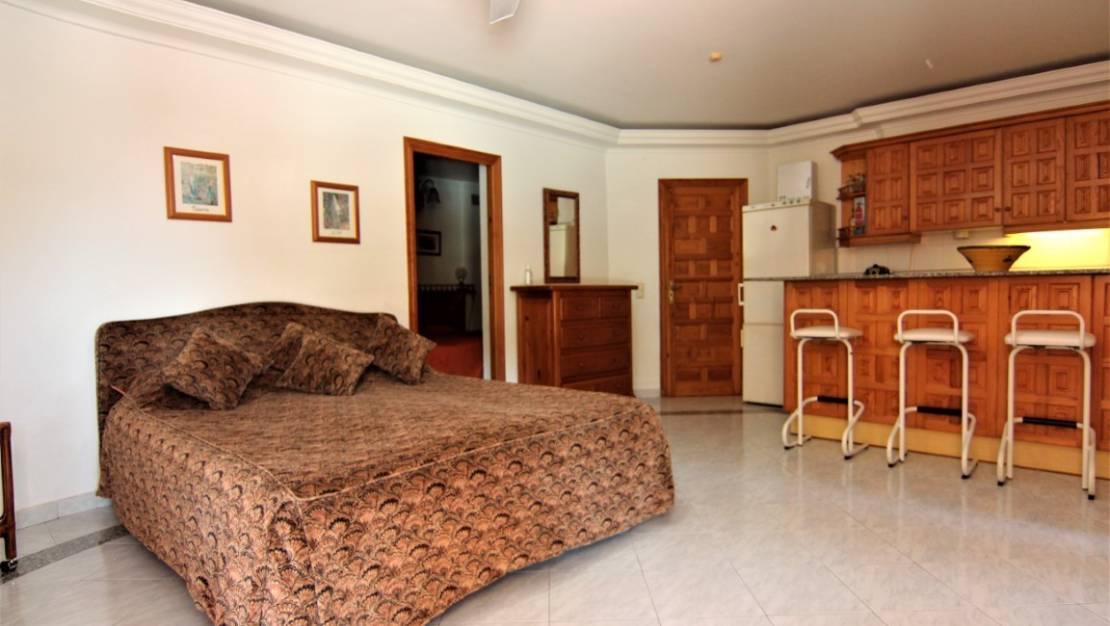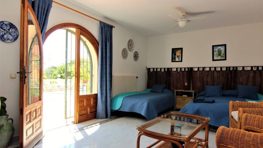 This very spacious villa with sea view is located within walking distance from the sea. The villa is spread over 2 floors and is ideal for Bed and Breakfast. On the top floor is the main house. Here you will find a spacious living room with dining area, a fully equipped kitchen, a guest toilet, a double bedroom, a bathroom and the master bedroom. On the lower floor which is also accessible by stairs from the upper floor are 3 independent fully equipped apartments which can sleep more than 12 people. Besides the spacious terrace with the large pool there is a large covered terrace with bar and professional kitchen which is ideal for holding dinners for large groups. There are also several other seating areas spread over the plot. The villa offers many extras such as a sauna, a Jacuzzi, a second outdoor kitchen, two laundry rooms and a large pond with waterfall. Also, the large plot offers parking for several cars.