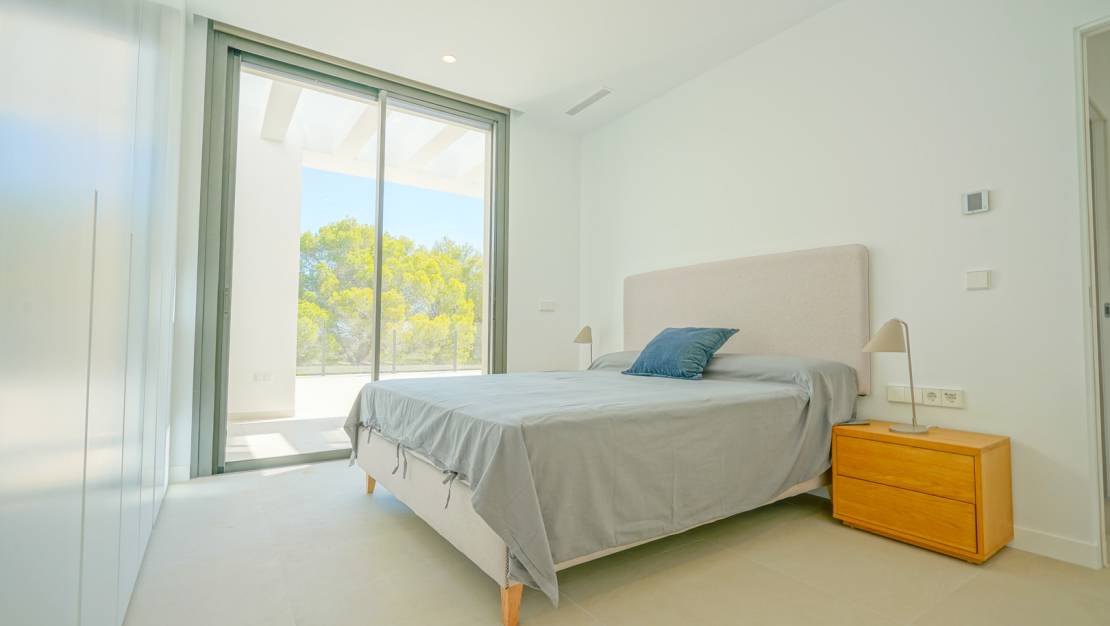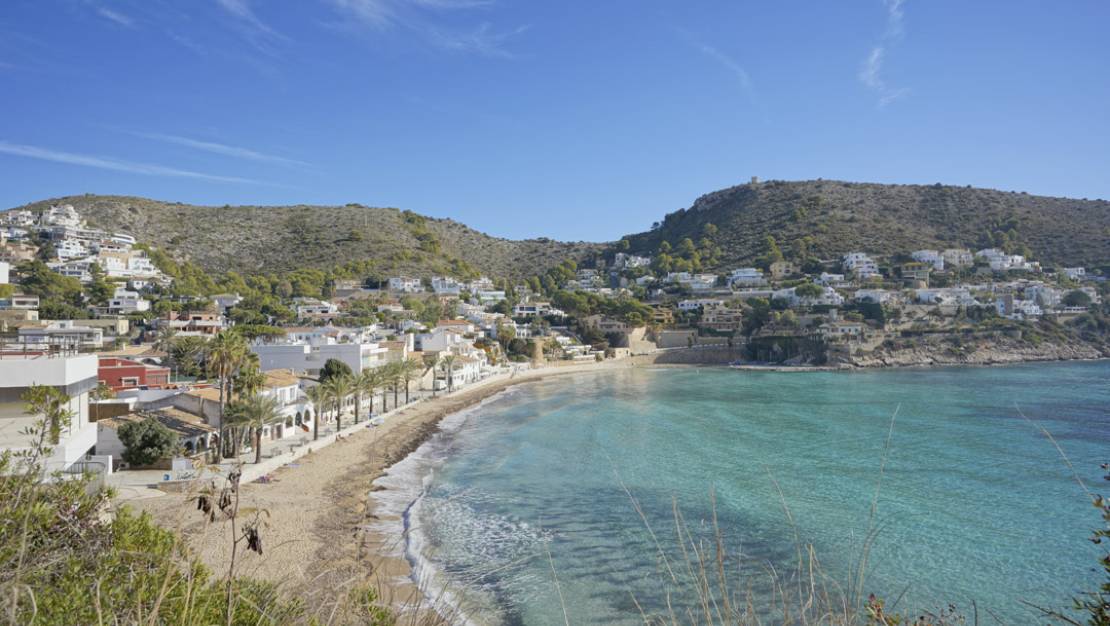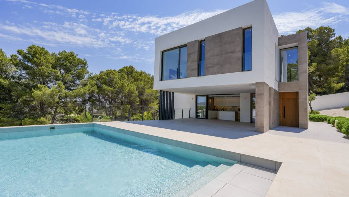 This beautiful villa is located in a quiet area less than 10 minutes from the beach and the centre of Moraira. The villa is surrounded by a wooded area and is spread over three floors. The first floor comprises a spacious living-dining room, an open-plan kitchen, a double bedroom with an en suite bathroom and a guest toilet. Through sliding windows there is access to a large partially covered poolside terrace. On the second floor you will find the master suite with a large dressing room and en suite bathroom and two double bedrooms sharing a bathroom. All bedrooms on this floor have access to a large terrace with a pergola. The ground floor consists of a garage with space for two cars, the driveway in front of the garage has parking space for two more cars. In addition, on the ground floor there is a very large laundry room, a drying room, a gym, a storage room, a technical room and an outdoor bathroom. The villa is surrounded by a low-maintenance Mediterranean garden and has automatic irrigation. The villa also has air conditioning and underfloor heating. The villa is completely finished and sold furbished.