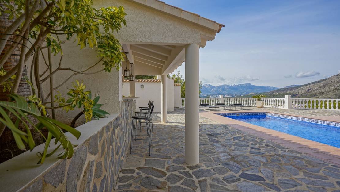 This beautiful Mediterranean villa is located in one of Altea's prestigious urbanisations at the foot of the southern flank of the majestic Sierra de Bernia. The villa offers breathtaking views of the nearby mountain range and the vast mountainous landscape. Views include iconic mountains such as the Puig Campana and the Sierra Aitana. The villa was built in 2004 and always very well maintained. Thanks to a clever layout, the entire private residence of 173 m2 is located on one floor adjacent to the pool. One floor below is a spacious separate guest house of 113 m2 and a separate room that can be converted into a studio. The guest house is internally connected to the upper floor, but also has private access. An automatic gate gives access to the property with the driveway immediately splitting into two to give you the choice of parking at the entrance to the main house or at the entrance to the guest house. If you park at the main house, stairs lead to the front door. You enter a stylish hallway with a spacious, fully equipped kitchen to the right. The hallway flows into the living-dining room where you will also find a small office. Through a corridor, where there is an additional bathroom, you reach the master bedroom with walk-in wardrobe and en-suite bathroom. You can enjoy beautiful views of the landscape from all rooms. From both the living room and the bedroom, there is direct access to the poolside terrace via sliding windows. There is also a covered terrace on this floor, an outdoor kitchen with a bar and an outdoor shower. The guest house comprises a kitchen, a dining area from where you can also enjoy the beautiful views of Sierra de Bernia, a lounge, a bedroom with an en suite bathroom and two bedrooms sharing a bathroom. Opposite the guest house is a large room of about 44 m2 with several windows, ideal to transform into an extra bedroom, gym or a cosy studio. The guest house and studio share a private terrace. The villa has air conditioning in all rooms, central heating via radiators, shutters and built-in wardrobes. There is also camera security consisting of several cameras and an alarm system. The villa is surrounded by a low-maintenance garden equipped with automatic irrigation. There is also a garage. Both the beach and the centre of Altea are just a 10-minute drive away. Larger towns like Calpe or Benidorm can be reached in 15 minutes. Alicante airport is a 50-minute drive away. Within walking distance of the villa is the beautiful golf club of Altea. Altea is a paradise located between the mountains and the Mediterranean Sea. You only have to walk along its more than 6 kilometres of coastline to discover the wide variety of beaches, such as L'Olla, Solsida, Cap Negret, Albir, Cala del Mascarat and La Roda. These beaches are characterised by pebbles rather than sand and some coves are even hidden between large cliffs. There is also the charming old town. With narrow, cobbled streets, white houses full of colourful flowers and hidden nooks and lookouts, this is a wonderful place to stroll around. Don't hesitate any longer and come discover this fantastic villa now!