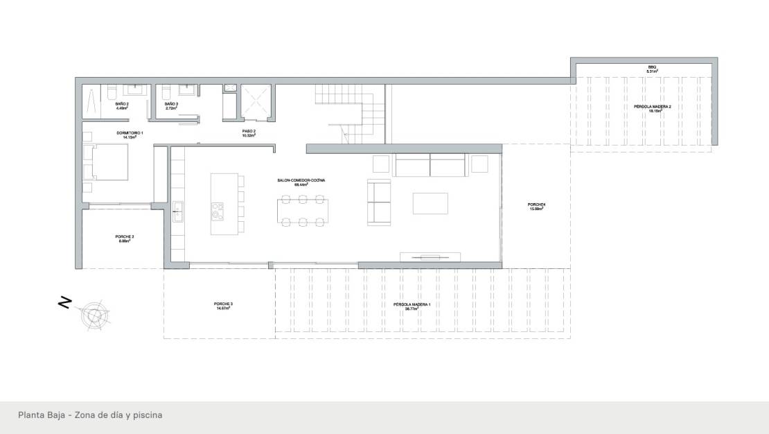 This new build villa will be built on a spacious 1500 m2 plot in the luxurious Raco de Galeno urbanisation 2 km from the beautiful coast of Benissa. The villa has a total built area of 459 m2 distributed over two floors + a basement with a double garage. The ground floor comprises a spacious living-dining room with a modern, open-plan kitchen, a bedroom with an en suite bathroom and private terrace and a guest toilet. On the upper floor there are three more luxurious bedrooms, each with an en suite bathroom and dressing room. One bedroom has access to a private terrace through sliding windows and the other two bedrooms share a very spacious terrace. The basement comprises a garage with parking space for two cars, an entrance hall and a guest toilet. Outside, there is a swimming pool surrounded by several terraces both covered and uncovered. The villa has a spacious driveway with access to the garage. A pre-installation for pool heating and a pre-installation for an alarm system will be installed. The air conditioning system being installed is the AEROTHERMIA system for heating and cooling and underfloor heating throughout the house with AIRZONE system. The project already has a licence and can be built in one year.