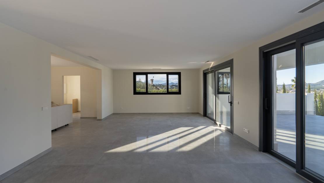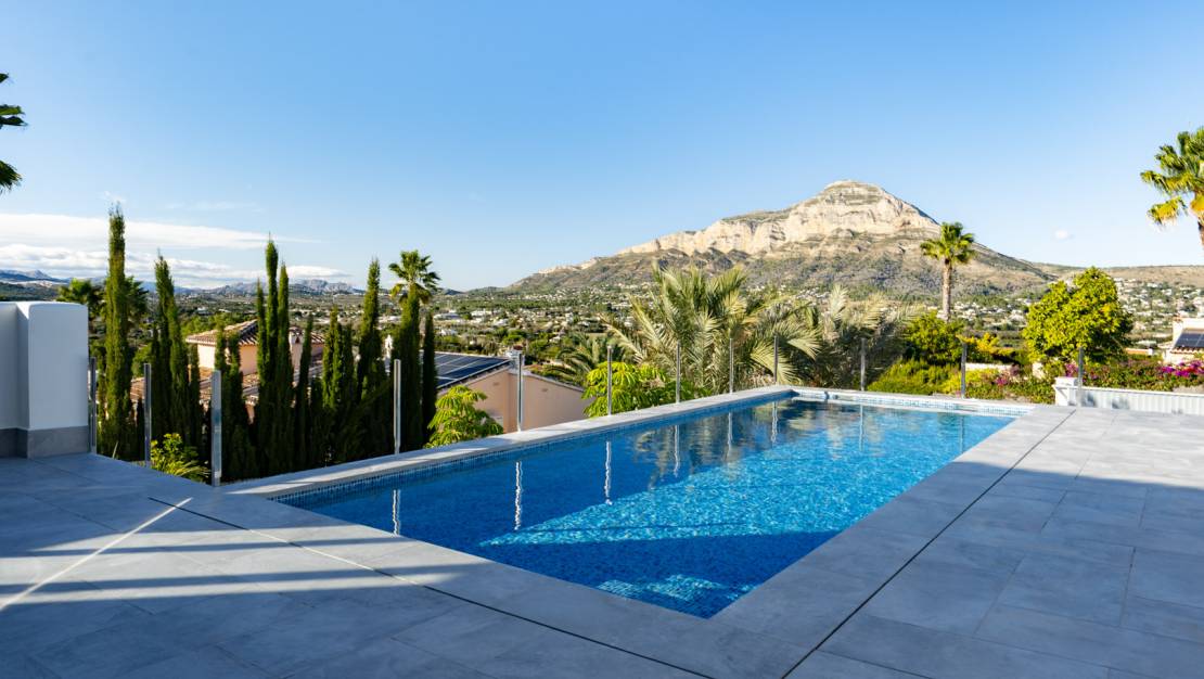 Beautiful traditional new build villa for sale in Jávea, This exclusive new build villa, located in the beautiful Piver urbanisation, offers beautifl views of the imposing Montgó and the mountainous interior. The villa is set on a spacious plot of 1,147.94 m2 and is designed entirely on one level for optimal comfort and accessibility. Upon entering, a stylish hall with guest toilet leads to the spacious living-dining room, where large windows provide abundant natural light and a beautiful panorama. Adjacent is a modern, fully equipped kitchen with a practical laundry room that offers direct access to the outside. Sliding windows in the living room open onto the inviting terrace with swimming pool, ideal for enjoying the view and the Mediterranean climate. The sleeping area comprises three bedrooms, including an elegant master bedroom with en-suite bathroom and direct access to the terrace, while the two other bedrooms share a second bathroom. The outdoor area is an oasis of tranquillity with a covered terrace, a pergola, a spacious sun terrace and a low-maintenance Mediterranean garden. With two parking spaces on site and a location just 2 km from the historic centre and 3 km from the coast, this villa combines luxury, privacy and excellent accessibility. The villa is currently under construction and is scheduled for completion at the end of 2025 (subject to change).