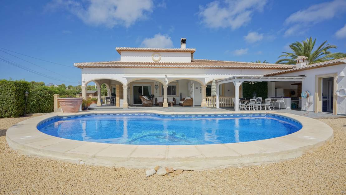 Traditional villa for sale in Costa Nova. This single-storey 3-bedroom villa is located on a flat plot in the charming Costa Nova urbanisation, within walking distance of various restaurants, cosy bars and sports facilities. A few steps lead to the veranda at the front door and into an entrance hall. From the hall, you enter the spacious, open kitchen with an adjoining dining area. Next to the dining area is a  living room with a fireplace. The eastern side of the villa features a master bedroom with an en-suite bathroom and two bedrooms with a shared bathroom. All bedrooms have built-in wardrobes, shutters and air conditioning. The villa features underfloor heating and a fireplace to guarantee maximum confort all year round. Besides the villa has a laundry room located in between the kitchen and the hallway. Outside, there is a spacious covered terrace on both the south and west side of the villa. There is also a large swimming pool with an outdoor kitchen and an outdoor bathroom. Ideal to spend long summer evenings outdoors. The villa is surrounded by a mature Mediterranean garden and has several parking spaces, a carport and a storage room. Costa Nova is a quiet, residential urbanisation on the south side of Jávea, known for its proximity to some of the most beautiful and unspoilt bays on the Costa Blanca. Just a few minutes' drive, or even walking distance, away are Cala Portitxol (La Barraca), Cala Ambolo, Cala Granadella and Cala Sardinera. These small, idyllic beaches are characterised by clear blue waters, rugged cliffs and a natural environment, perfect for swimming, snorkelling or kayaking. A beautiful villa in a prime location. Request your visit now.
