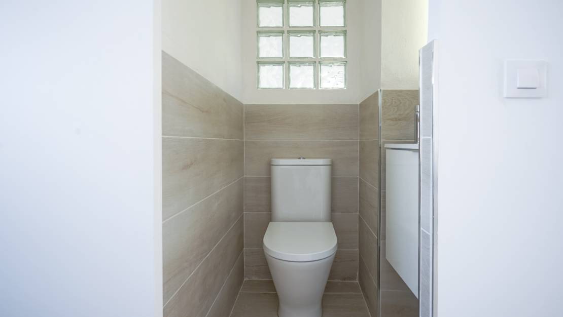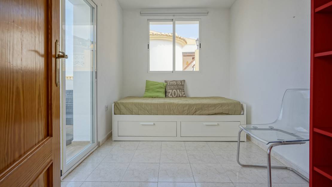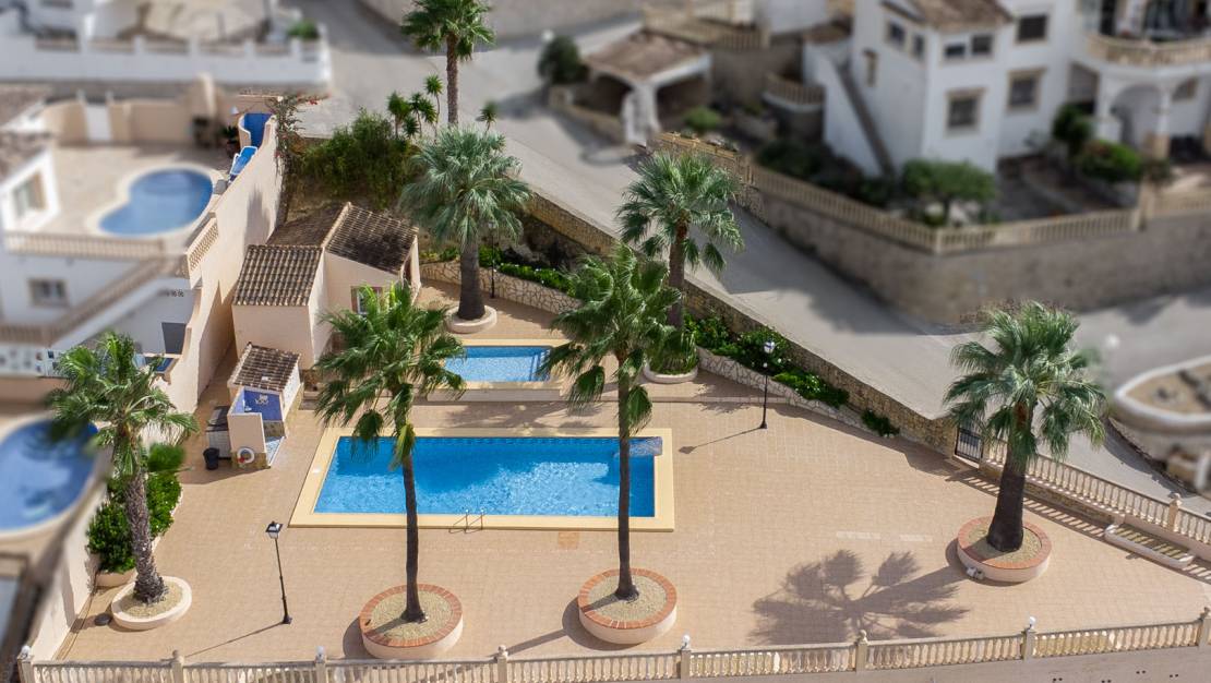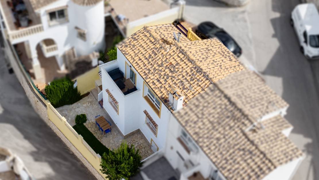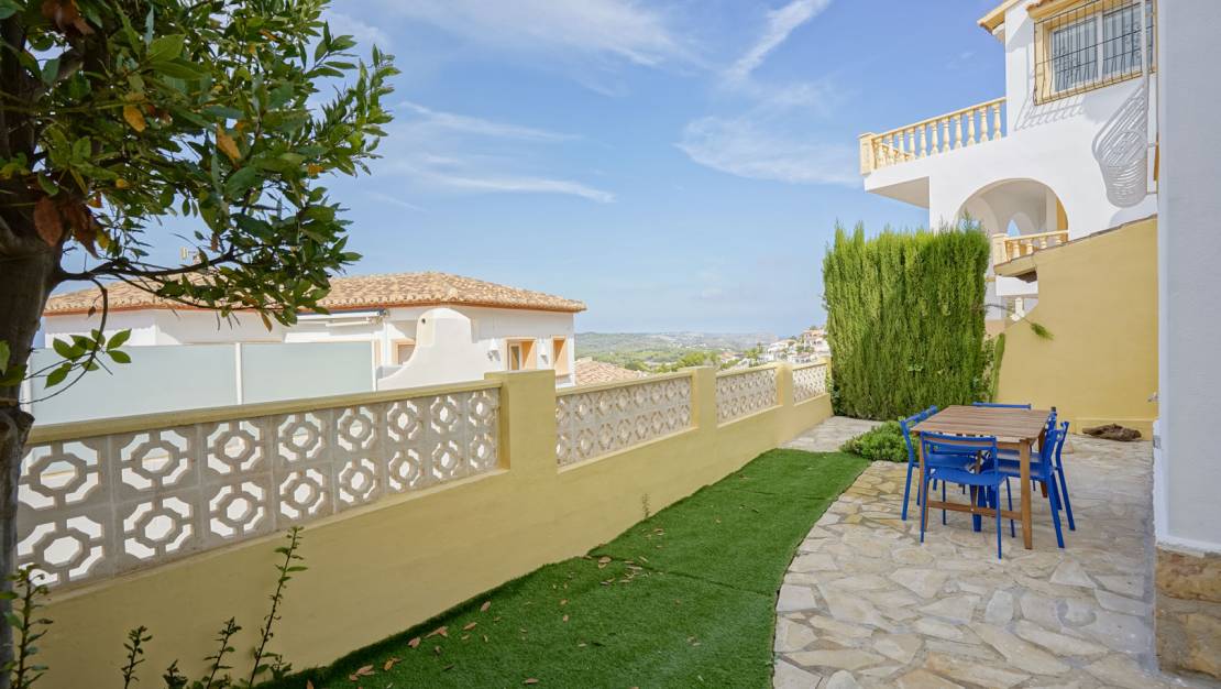 Semi-detached 2-bedroom house for sale in Calistros, Benitachell. This semi-detached house is located on a cul-de-sac in the quiet Las Mimosas urbanisation in Calistros and offers sweeping views over the Benitachell valley to Montgó. The property is spread over two floors. The upper floor consists of a living-dining room with a pellet stove, an open-plan kitchen, a guest toilet and an extra room, ideal as an office or extra bedroom. There is also a balcony where you can enjoy the panoramic views. The ground floor consists of two double bedrooms with a spacious shared bathroom, which also houses the laundry room. Here too there is a stove and infrared heating. Downstairs there is an easy-to-maintain garden with a barbecue area and a storage room. In addition, the villa has a parking space in front of the property and access to the communal swimming pool, located just 40 metres away. The centre of Benitachell is only 5 minutes away and the beaches of Moraira and Jávea are within 15 minutes. Do not hesitate any longer and request your visit now!