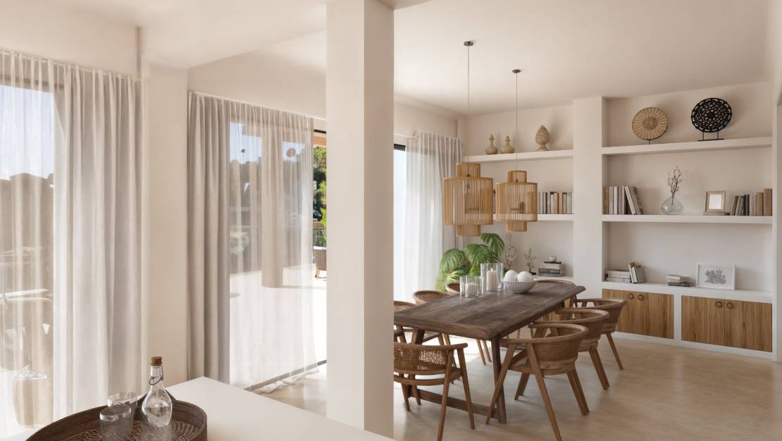 Ibiza-style villa project with sea views for sale in Benissa This exclusive Ibiza-style villa project is located in the modern villa district of Racó de Galeno in Benissa and offers breathtaking panoramic views of the Mediterranean Sea. The villa combines modern elegance with Mediterranean charm and is being built with high-quality materials and finishes of the highest standard. The ground floor consists of a spacious living room with an open-plan kitchen with cooking island, dining area and lounge overlooking the pool and sea. On the same floor are two double bedrooms, each with an en-suite bathroom, and a guest toilet for added convenience. Upstairs is the master suite with a dressing room and en-suite bathroom, as well as a fourth bedroom with en-suite bathroom. Both rooms give access to a spacious sun terrace with pergola and an ideal south-west orientation, where you can enjoy the sun until late in the evening. The basement comprises a spacious garage, a gym, a cinema room and an additional bathroom. From the living room, a large sliding window leads to the sunny terrace with infinity pool, several pergolas and an inviting lounge area, surrounded by a Mediterranean garden. Only top-quality materials are used in the construction of this villa. The interior and exterior walls will have an elegant Ibiza-style plaster finish with integrated skirting boards for a seamless look. The windows and sliding doors are from the TECHNAL brand, model SOLEAL, with recessed profiles and electric shutters in all bedrooms. Inside, underfloor heating and ducted air conditioning ensure optimal comfort throughout the year. The kitchen will be finished in the characteristic Ibiza style, with natural tones and high-quality finishes, including built-in appliances. The bathrooms are finished in mortar, microcement or tiling, with ROCA sanitary ware and FIMA SPILLO taps in elegant matt black. The infinity pool is lined with Bassetes mosaic tiles and is pre-installed for heating. The outdoor space reflects the same refinement: natural stone garden walls combined with white plastered facades, wooden pergolas with polycarbonate roofs and terraces with flooring that matches the interior. The location is ideal: the centre of Calpe is less than a ten-minute drive away, as is the idyllic coastline of Benissa with its crystal-clear coves. This villa offers a perfect balance between style, comfort and location.