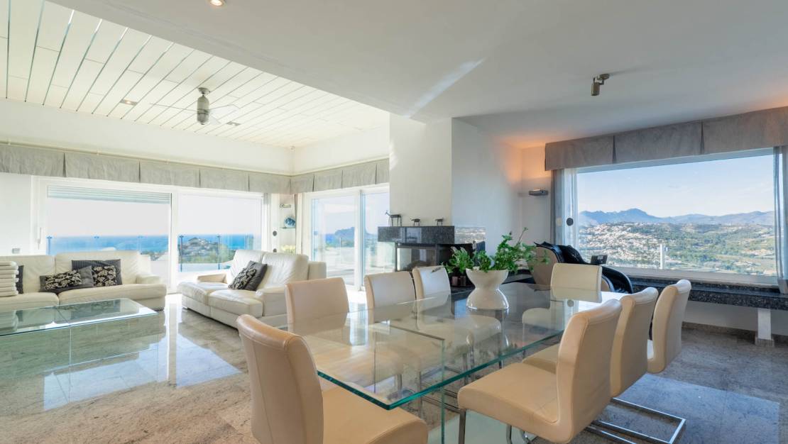 Spectacular luxury villa with panoramic views of the sea, Moraira, and the iconic Peñón de Ifach in Calpe. Located in one of the most exclusive areas of the Costa Blanca, this property combines contemporary design, maximum privacy, and a privileged location just minutes from the center of Moraira. On the main floor of the villa, an elegant entrance hall with high ceilings welcomes you and leads to a spacious and bright living-dining room with large windows that frame the breathtaking views. The modern, fully equipped open-plan kitchen is complemented by a practical laundry room. Also on this floor is the master bedroom, which features an en-suite bathroom, dressing room, and direct access to the terrace, as well as a guest toilet. The lower floor houses three additional bedrooms, all with direct access to the terrace and sea views, as well as three bathrooms (one en-suite). This floor also includes a wellness area with a sauna, ideal for moments of relaxation. The exterior is designed to enjoy the Mediterranean climate year-round: a fully equipped outdoor kitchen, a spacious chill-out terrace, a heated infinity pool that visually merges with the sea, and a private jacuzzi. The property also includes a spacious garage with room for several vehicles. Moraira is a charming coastal town known for its crystal-clear beaches, elegant marina, fine dining restaurants, and a tranquil and sophisticated atmosphere throughout the year. Surrounded by natural landscapes, hidden coves, and coastal paths, it is one of the most sought-after destinations for those seeking quality of life, security, and exclusivity. A unique opportunity to enjoy luxury, comfort, and unparalleled views in one of the most exclusive destinations on the Costa Blanca. Ideal as a permanent residence, a high-end second home, or a premium investment.