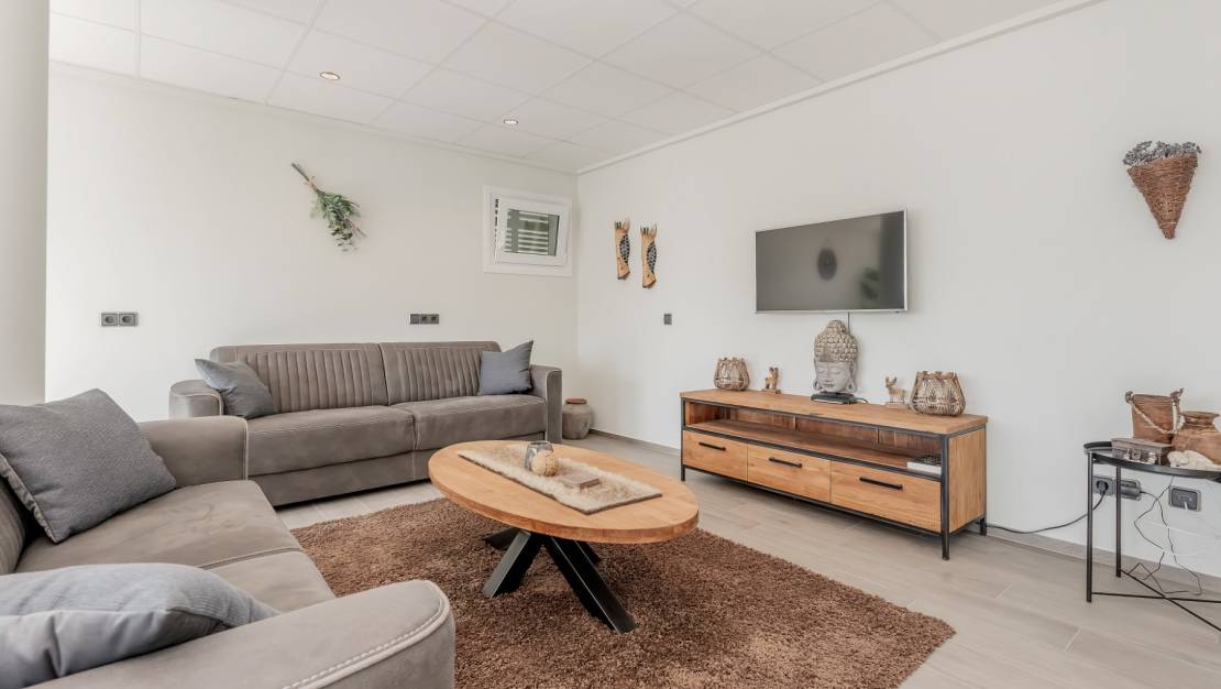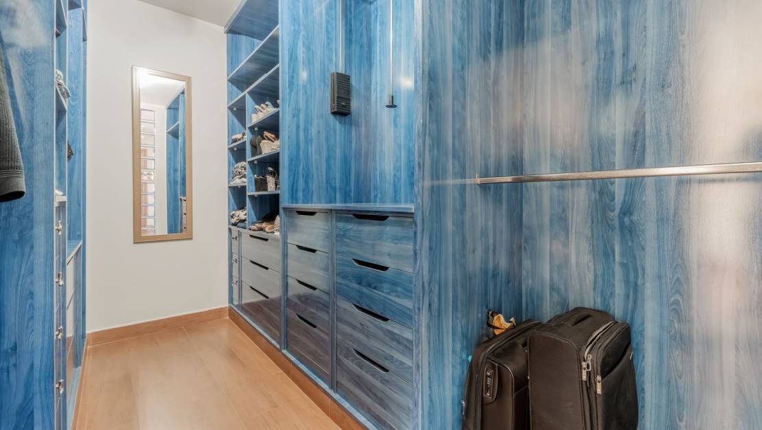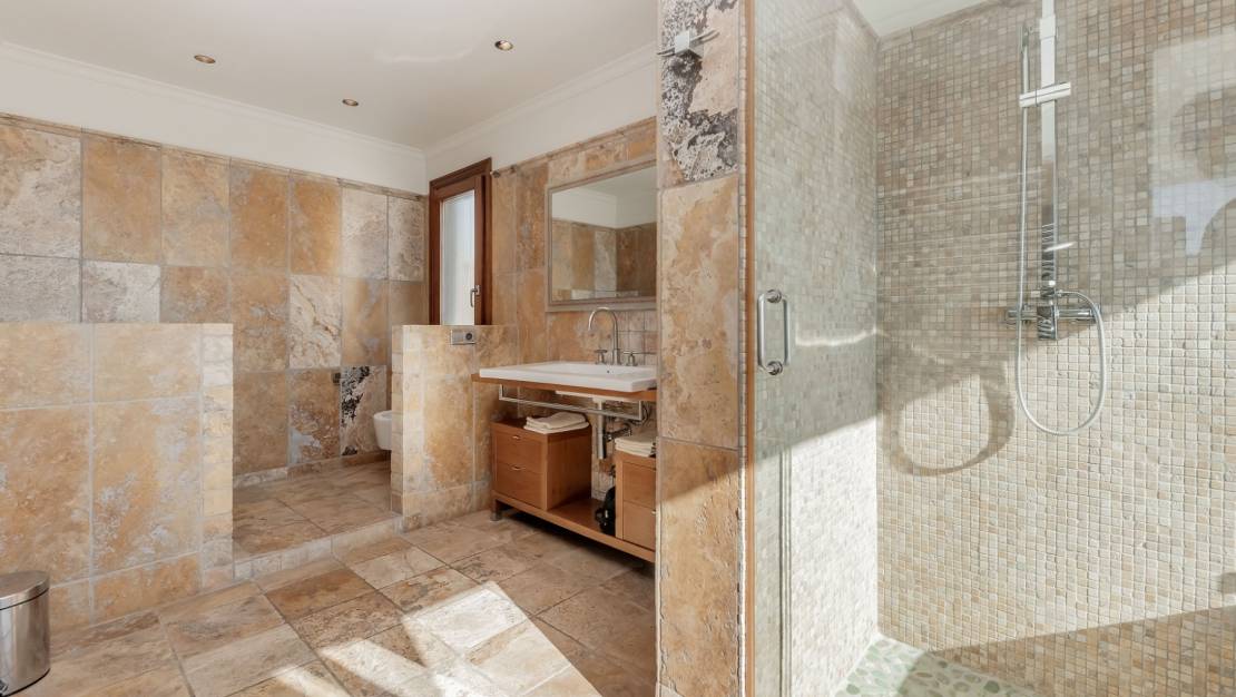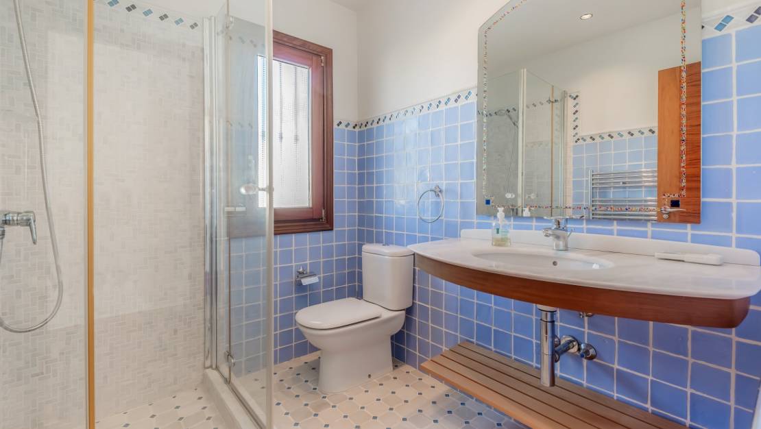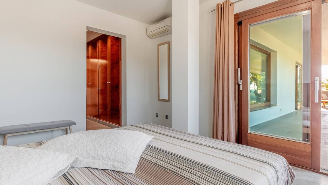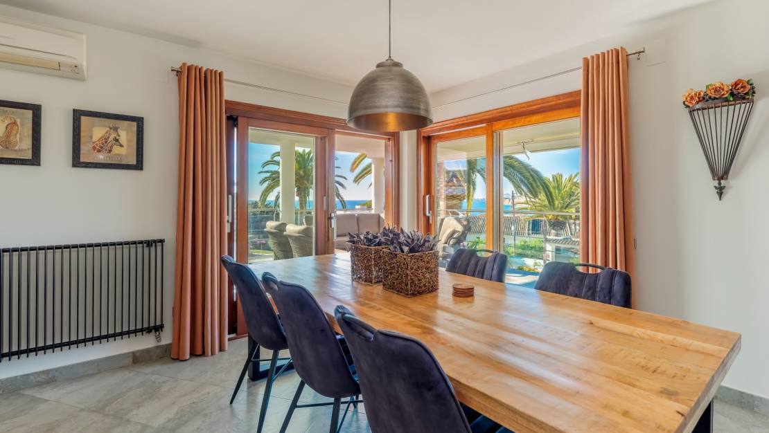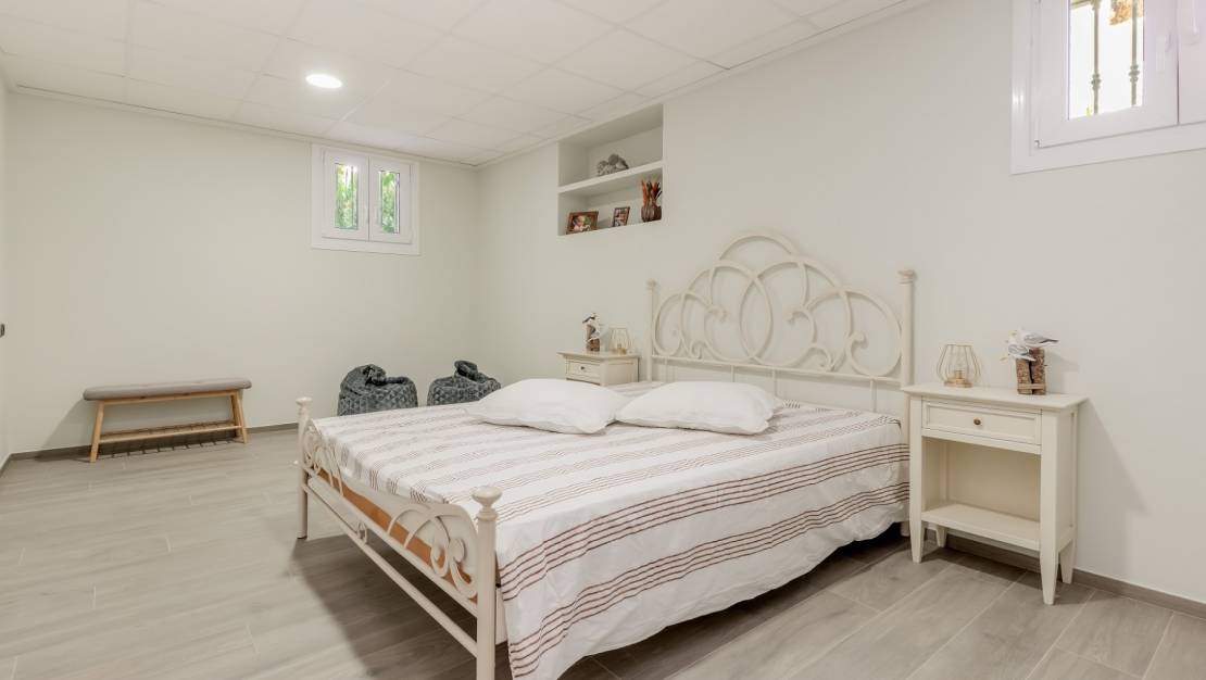 On the ground floor, there is a spacious garage with space for several cars. Furthermore a living room with sliding doors that provide direct access to the terrace and swimming pool. Next to this is a hallway leading to two spacious bedrooms and a shared bathroom. The first floor has a living and dining room with access to a covered south-facing naya with a magnificent sea view. There is also a kitchen with separate storage space, a wardrobe, two bedrooms and two bathrooms, one of which is en-suite. The top floor consists of two spacious bedrooms, both with en-suite bathrooms. One bedroom also has a spacious walk-in wardrobe. Sliding windows give both rooms access to a large outdoor terrace with sea views. The outdoor area consists of a mature, low-maintenance Mediterranean garden with, next to the garage, enough space to park several cars on site.