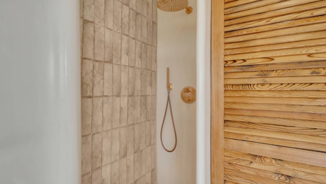 On the main floor, there is a spacious bedroom with built-in closets and an en-suite microcement bathroom with a walk-in shower and direct access to the terrace. The upper floor features a multifunctional space and two bedrooms, each with its own bathroom. The master bedroom is a real eye-catcher with panoramic sea views, an open bathroom with a freestanding bathtub and shower, a dressing area, and a private covered terrace.