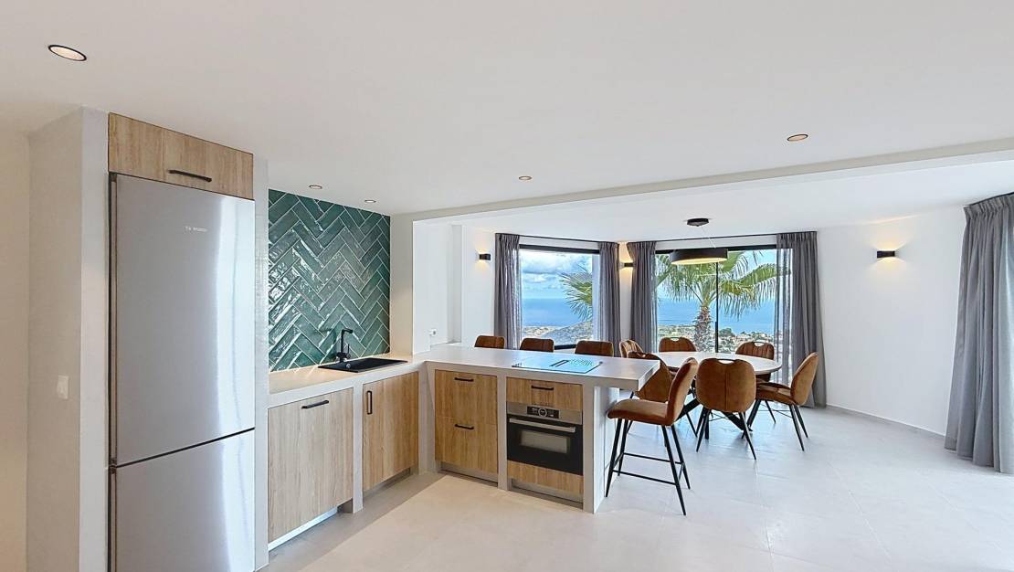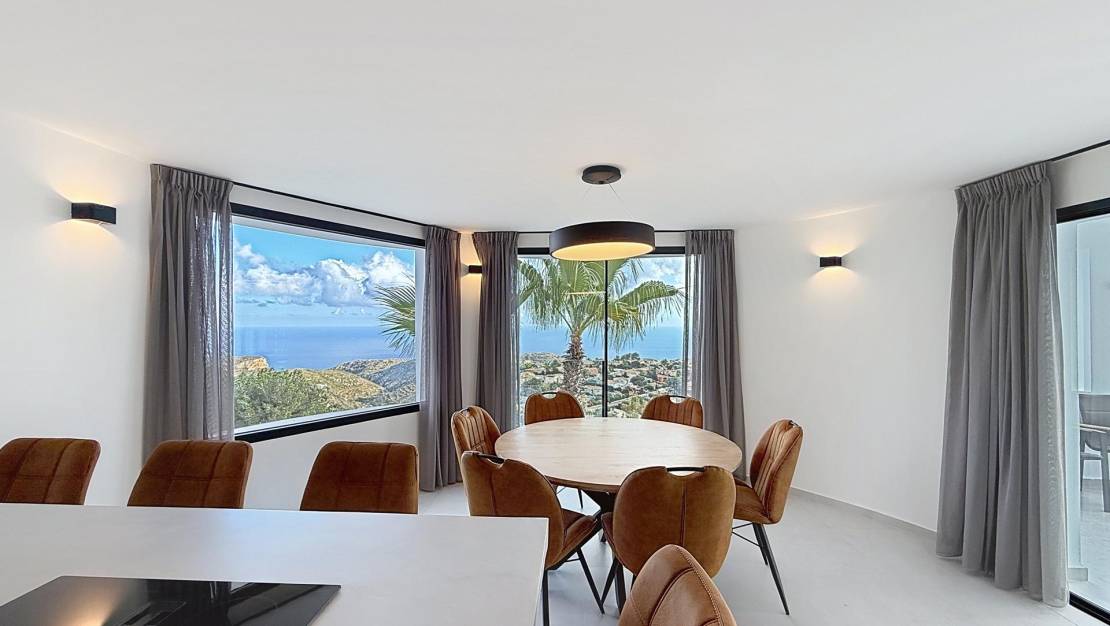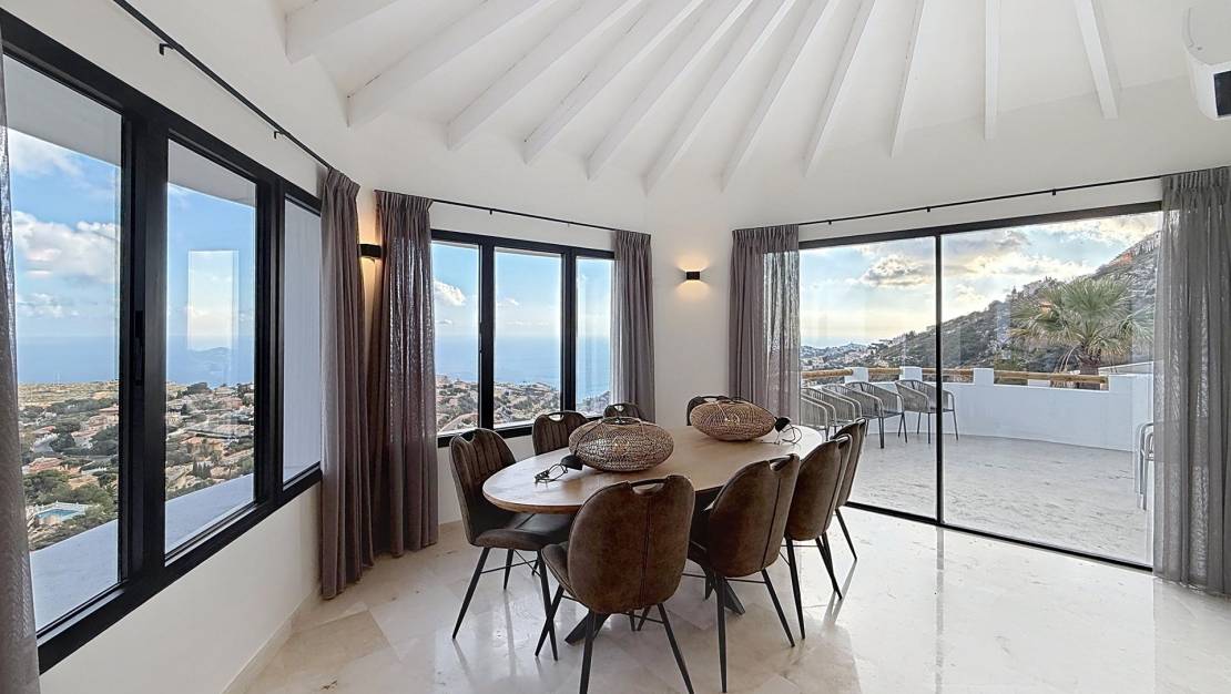 Renovated villa with panoramic sea views in Dalias – Cumbre del SolA modern home with Mediterranean charm between Jávea and MorairaWe present a brand new, recently renovated villa with panoramic views of the Mediterranean Sea and a private swimming pool, located in the residential area of Dalias, within the prestigious Cumbre del Sol residential complex in Benitachell, between Jávea and Moraira. With a total built area of approximately 325 m² on a plot of 1,032 m², this property offers spaciousness, privacy and an ideal location to enjoy the Mediterranean lifestyle all year round. Hybrid design: contemporary interior, Mediterranean-Ibizan exteriorThis villa perfectly combines the traditional architecture of the Costa Blanca, with its white walls and soft lines, and a completely renovated interior in a modern, bright and functional style. Each space has been designed to make the most of the natural light and open sea views, creating a warm and welcoming atmosphere. Spread over two floors, the property has: 5 double bedrooms, all with their own en-suite bathroom; three of them enjoy sea views.Main living/dining room with fireplace and open-plan kitchen, connected to an outdoor terrace ideal for breakfast overlooking the Mediterranean.Guest toilet and a second living/dining room with kitchenette, perfect for guests or as a separate area, with direct access to the covered terrace and swimming pool.Spacious multi-purpose room, which can be used as a gym, office, leisure room or home cinema.Technical room and storage room, providing practicality and storage space.Comfort and modern amenitiesRenovated with contemporary materials and quality finishes, this property offers a high level of comfort: Underfloor heating throughout the house.Split air conditioning in all rooms.Alarm system and solar panels for greater energy efficiency.Brand new furniture, included in the price, ready to move in.Its balanced design between modern and Mediterranean creates a home with character and personality, where every detail is designed for daily well-being. A peaceful setting with all amenities nearbyThe Dalias residential area is located at the northern entrance to the Cumbre del Sol residential development, one of the most sought-after on the northern Costa Blanca. From here, you have easy access to beaches, coves and all essential amenities, such as the Adelfas Shopping Centre, the La Cumbre Restaurant, the Lady Elizabeth School, the sports centre with tennis and paddle tennis courts, and several supermarkets. In addition, a short drive away you can enjoy the coves of Moraig, Llebeig and Los Tiestos, as well as the golf course in Jávea and the charming promenade in Moraira. A home with a Mediterranean soulThis villa represents the essence of the Mediterranean lifestyle: endless sea views, bright spaces, and a perfect blend of tradition and modernity. Ideal as a family home, second home or profitable investment in one of the most sought-after areas of the Costa Blanca. Would you like to come and see it?Contact us today to arrange a personalised viewing. We will be delighted to show you every corner of this house and help you discover everything it has to offer. Your new home awaits you in Cumbre del Sol. Summary of the Dalias Residential Area – Cumbre del SolThe Dalias Residential Area is one of the most attractive areas of the Cumbre del Sol development, comprising 146 private plots ranging from 750 to 1,200 m². Its east and south-west orientation guarantees excellent light and spectacular views of the Mediterranean Sea, Cabo de la Nao and Portet de Moraira. In the surrounding area you will find a full range of services: Lady Elizabeth International School, sports centres, supermarkets, restaurants, and the best beaches and coves on the northern Costa Blanca.