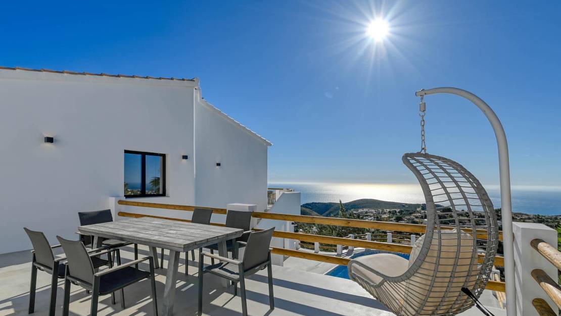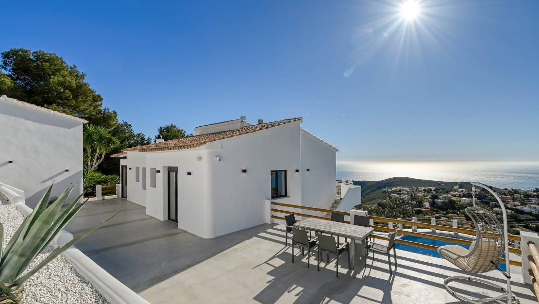 A striking, newly reformed Ibizan-style villa at the gateway to Cumbre del Sol—designed for effortless living and immediate impact. Set in a prime, elevated position, the villa embodies relaxed Mediterranean sophistication. Bathed in natural light, this is a home that impresses from the moment you arrive. Clean architectural lines, bright open spaces, and panoramic views from almost every room define the living experience. The main level is designed for seamless flow, featuring a spacious open-plan living area that connects directly to expansive terraces, the pool, and a fully equipped outdoor kitchen—ideal for entertaining. Five generous bedrooms and seven bathrooms provide exceptional space and privacy, with most bedrooms offering direct access to terraces or the pool. The lower level adds versatility with a separate living area and kitchenette—perfect for guests, extended family, or independent living. Practical features include a double garage, substantial storage, and a layout tailored for modern lifestyles. Located just a flat four-minute walk from LES Private International School, the property combines luxury with everyday convenience. A fully renovated villa with presence, panoramic views, and outstanding versatility—ready to be experienced. Property Highlights Fully renovated Open-plan living on the primary floor Air Conditioning Five spacious bedrooms Seven well-appointed bathrooms Additional living area with kitchenette on the lower floor Direct access from bedrooms to terraces and the pool area Expansive views from almost every room Outdoor kitchen for entertaining Double garage on street level Generous storage and dedicated laundry room Solar panels for improved energy efficiency South Orientation About The Area Set between the sought-after coastal enclaves of Moraira and Jávea, this villa is ideally positioned at the gateway to Cumbre del Sol in Benitachell—one of the Costa Blanca’s most desirable locations. Known for its panoramic sea views, crystal-clear coves, and dramatic coastline, the area blends natural beauty with privacy and exclusivity. With international schools, premium amenities, and easy access to beaches and dining, it offers a refined yet relaxed Mediterranean lifestyle.