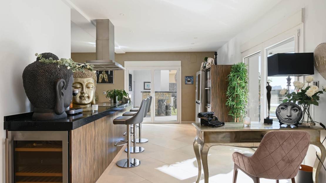 A well-equipped outdoor bar and kitchen invite long, unhurried evenings, while the poolside dining area promises relaxed entertaining in true Costa Blanca style. The exterior lounge, complete with an electric roof, adapts effortlessly to the moment creating a refined space for conversation, comfort, and effortless living.