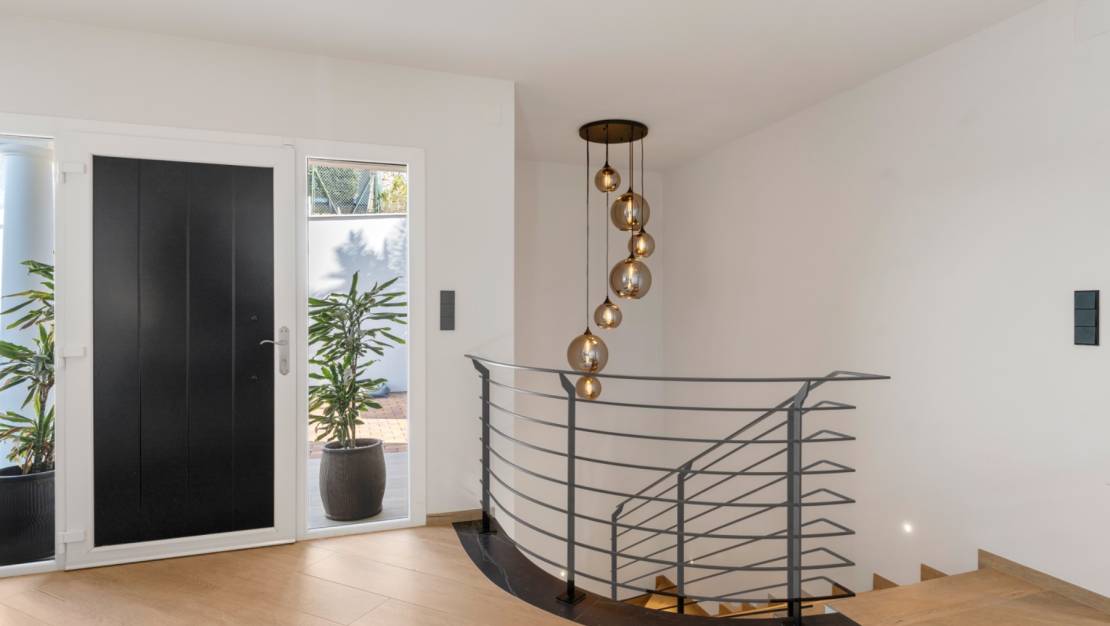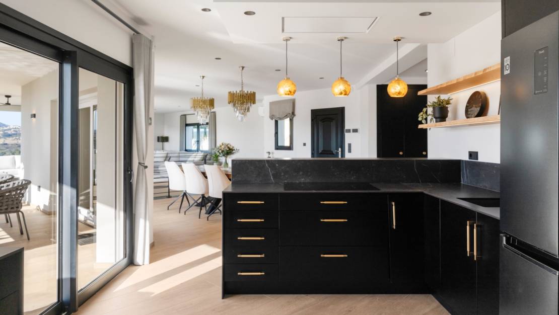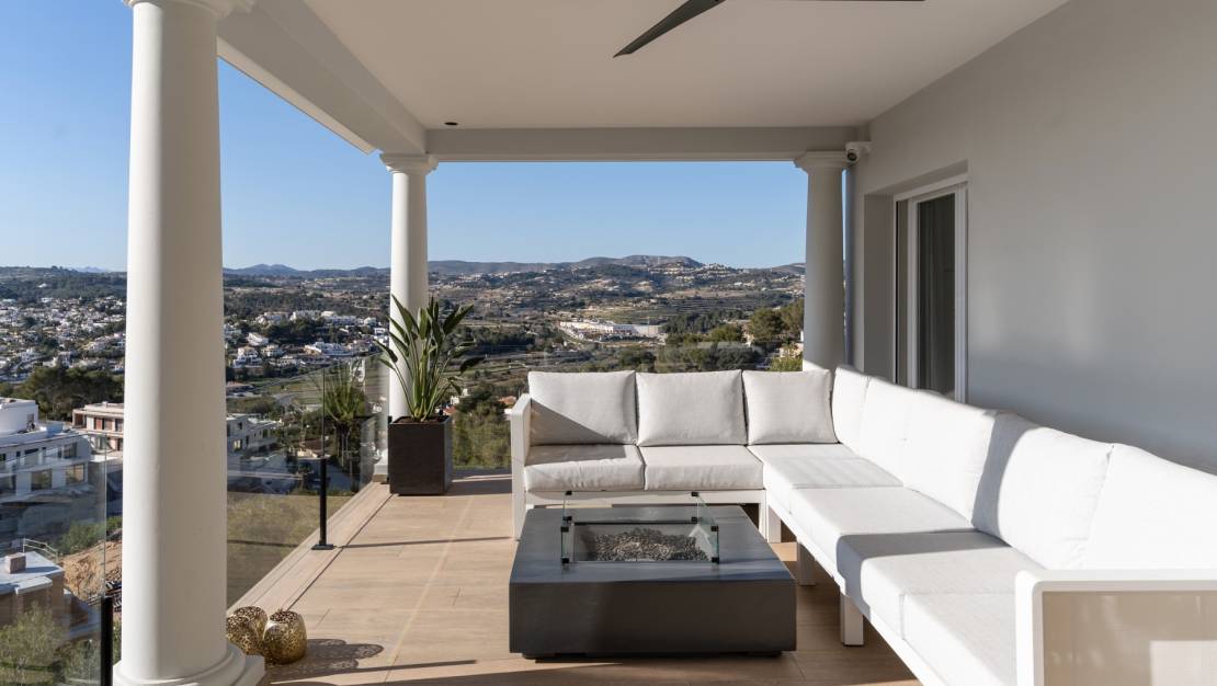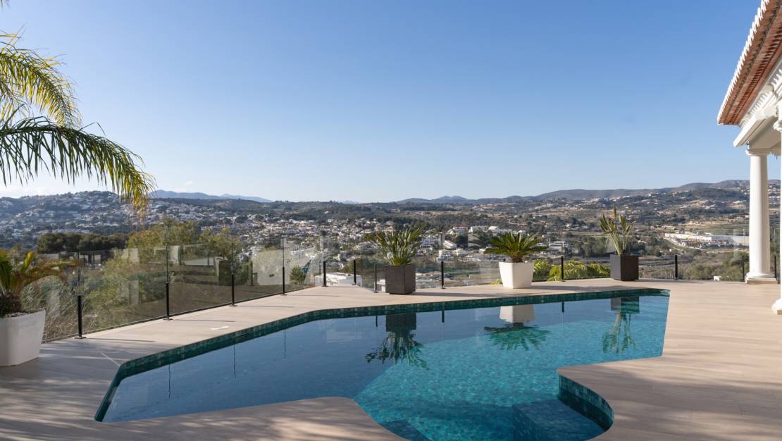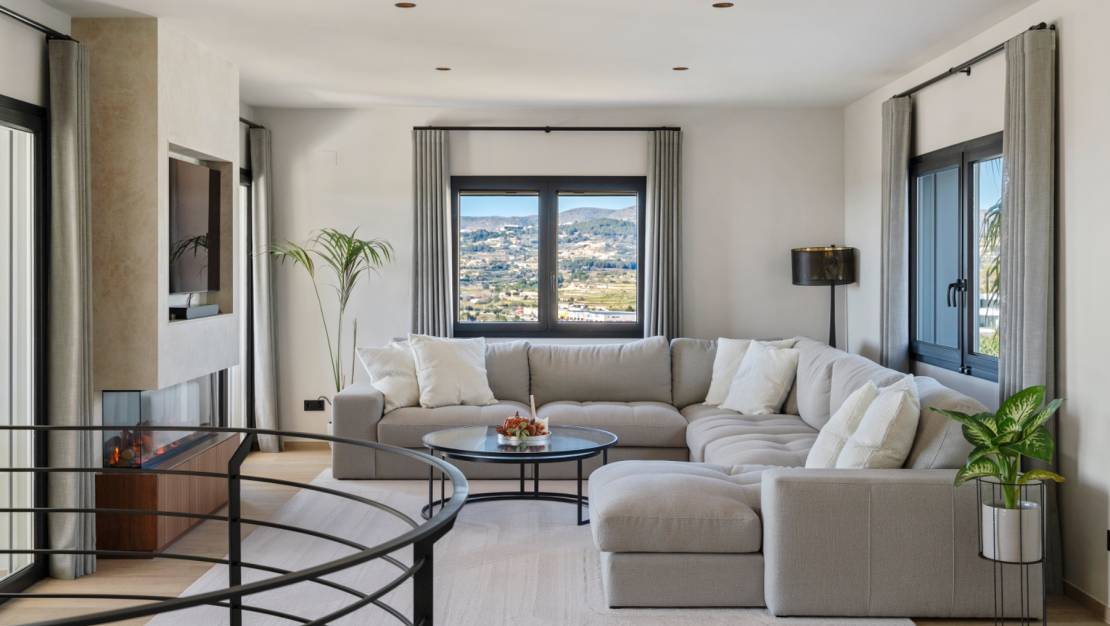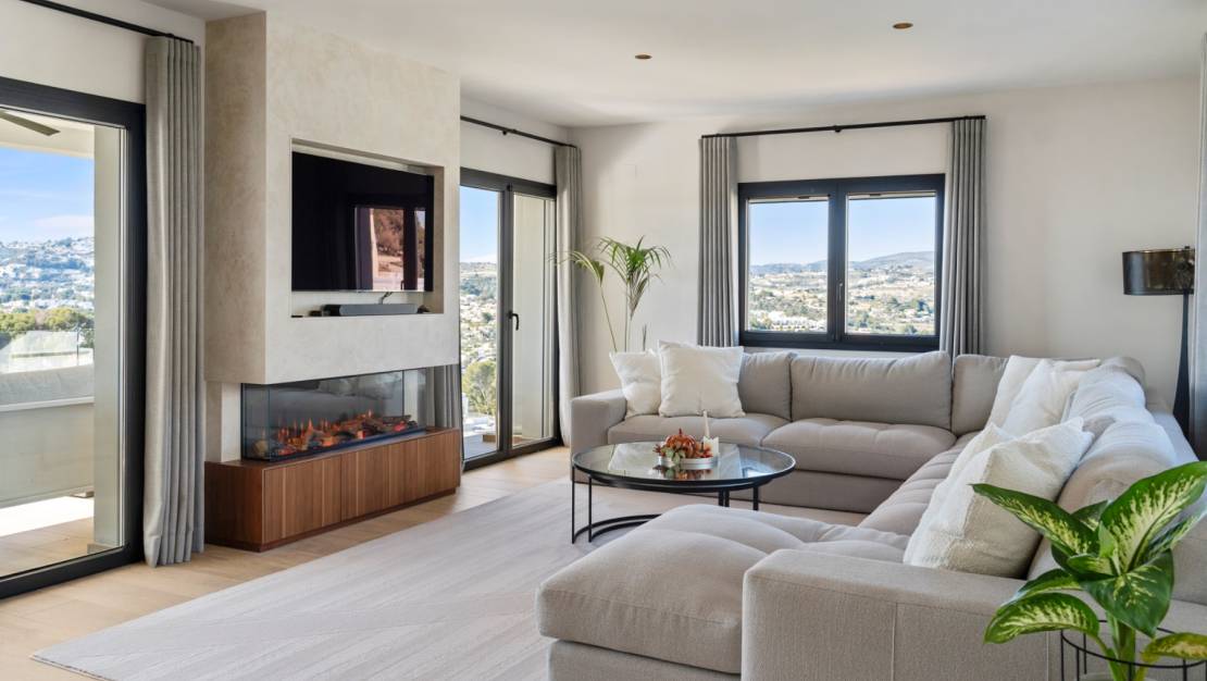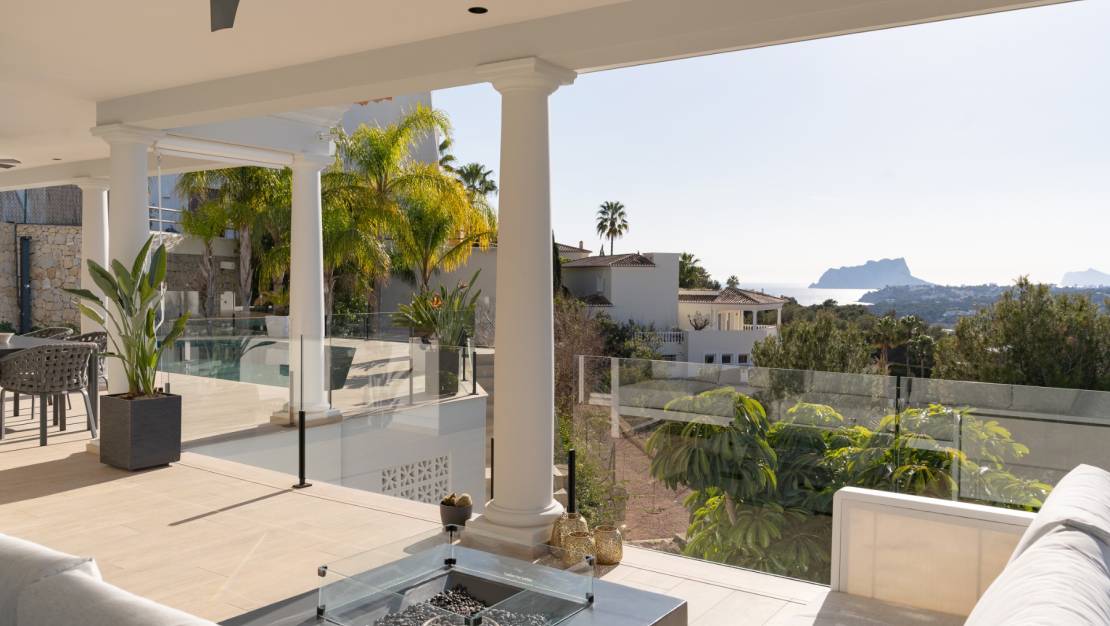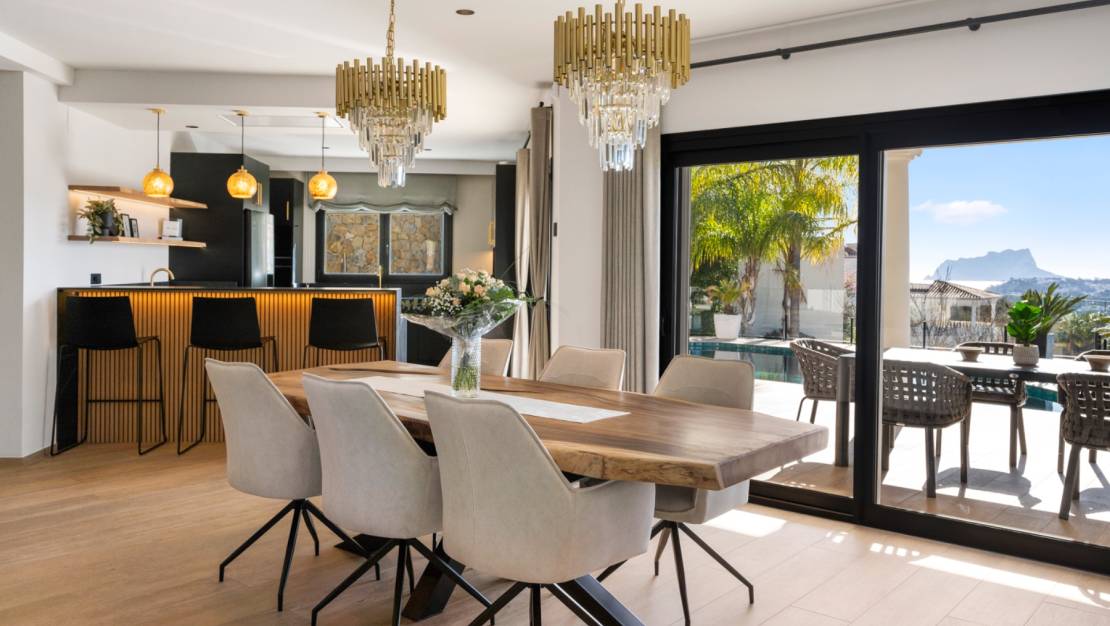 Built in 2008 and masterfully reformed in 2024, this exceptional villa combines timeless architecture with refined modern luxury. Spanning 375 m² across three levels and set on an 878 m² private plot, the home offers complete privacy and breathtaking panoramic views of the sea, the Peñón de Ifach, and the surrounding mountains. Ideally located in the prestigious area of La Arnella, it's just a five-minute drive from the centre of Moraira and its beautiful beaches. Every detail of this home reflects elegance and craftsmanship. The design blends warm tones with black and gold accents, creating a sophisticated and inviting atmosphere throughout. Equipped with underfloor heating, air conditioning in every room, an Asistel alarm system with video intercom, exterior security cameras, electric shutters in all bedrooms and bathrooms, and solar panels, this villa ensures comfort, efficiency, and peace of mind year-round. The lower level hosts two beautifully appointed bedrooms, each with its own en-suite bathroom with a shower, as well as a spacious studio-style room with a fully equipped kitchen and an office area that can easily be converted into an additional large bedroom. On the main floor, an elegant open-plan layout welcomes you with a bright entrance hall, a large kitchen with a breakfast bar, a pantry, and a laundry room, all seamlessly connected to the dining area and living room, which features an electric fireplace. Floor-to-ceiling glass doors open onto a generous terrace with a dining space, chill-out area, and private pool with a solar-heated outdoor shower, the perfect setting for entertaining or simply enjoying the Mediterranean lifestyle. This level also includes a guest toilet and a fully equipped outdoor gym with sauna, adding a touch of resort-style comfort. The top floor is dedicated to the impressive master suite, featuring built-in wardrobes on both sides and a stylish en-suite bathroom with double showers and a heated towel radiator. An additional bedroom with its own en-suite bathroom completes this level, offering space and privacy for family or guests. Additional highlights include a two-car garage with motorised roller doors and a secondary entrance. With its exceptional finishes, luxurious ambience, and panoramic views of the sea, Peñón de Ifach and the surrounding mountains.