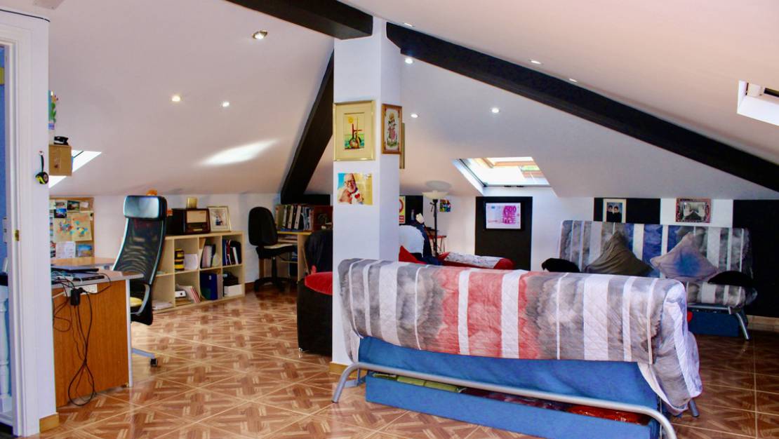 Inside the house there are three floors, two living rooms that connect with the two terraces and the kitchen. There are four bedrooms on the middle floor and two bedrooms with their own en-suite bathrooms. On the upper floor there is a games room which could be used as a further bedroom. And in the garage part of the house it has been made as a workshop and it is a magnificent part with another bathroom.