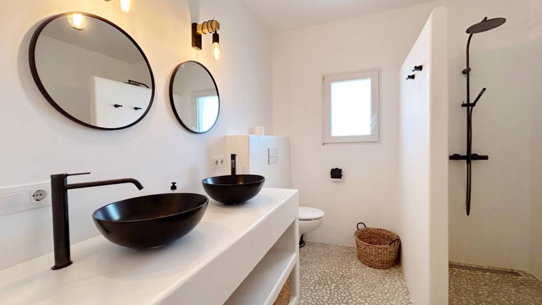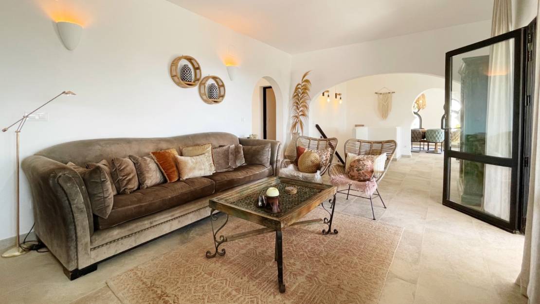 Доступ к дому возможен как через подъездную дорожку к навесу с автоматическими воротами, так и через пешеходную калитку. Подъездная дорожка ведет прямо в жилую зону, а пешеходная калитка ведет по небольшой лестнице к красивой деревянной бронированной двери. Эта дверь ведет на очень просторный этаж, разделенный на просторную гостиную с прямым выходом в наю, кухню, гостиную с камином и просторную столовую. Все эти комнаты имеют открытую планировку. Также имеется большая спальня, просторная ванная комната (с ванной и отдельным душем) и гостевой туалет. Из столовой лестница ведёт в башню, которая в настоящее время используется как спальня, но может также использоваться как кабинет с потрясающим видом. На нижнем этаже расположены ещё две спальни, ванная комната, большая кладовая и выход в бар/лаунж на просторной террасе у бассейна.