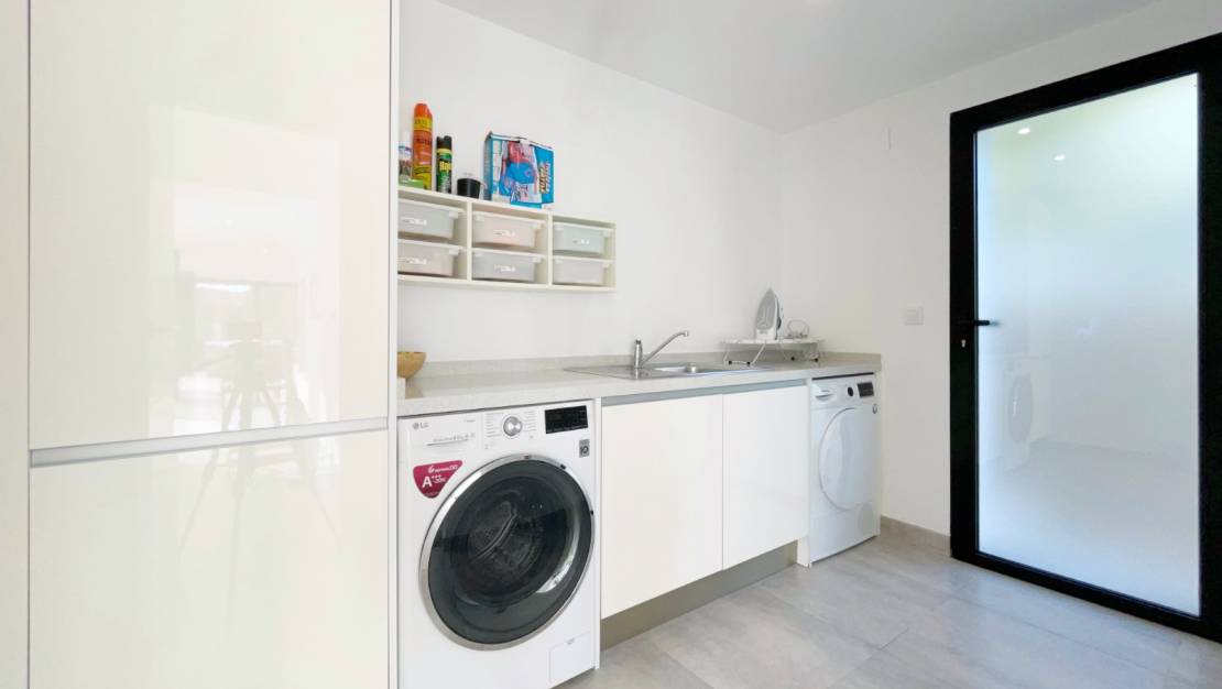 Внутренняя лестница ведет на первый этаж, где находится еще одна просторная спальня с собственной ванной комнатой. Светлая гостиная-столовая является центральным элементом дома, с большими окнами, соединяющими внутреннюю и внешнюю жилые зоны. Современная кухня открытой планировки с кухонным островом практично спроектирована и полностью оборудована. На этом этаже также находятся отдельная прачечная, дополнительная ванная комната и многофункциональное помещение, которое можно использовать как комнату отдыха, кабинет и т. д.