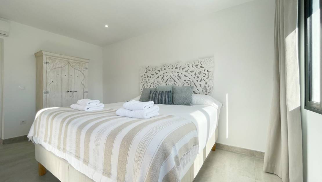 На верхнем этаже расположена просторная главная спальня с собственной ванной комнатой и прямым выходом на частную террасу с прекрасным видом на море и зеленые окрестности. Кроме того, на этом этаже расположены две спальни с двуспальными кроватями, которые имеют общую просторную ванную комнату, одна из которых также имеет выход на частную террасу. Из всех спален открывается потрясающий вид на море и долину.