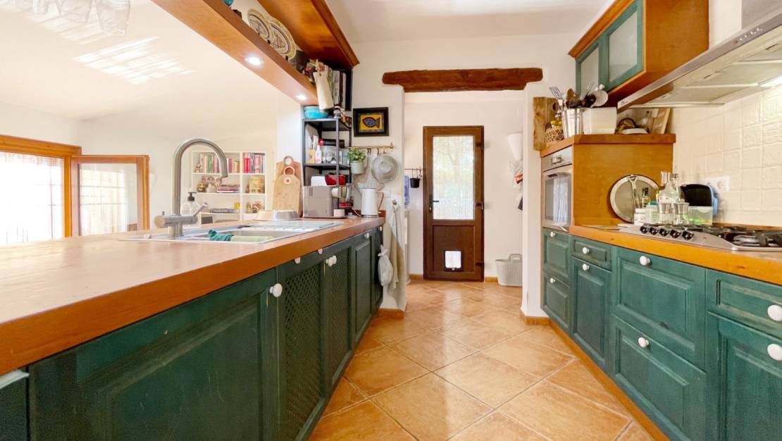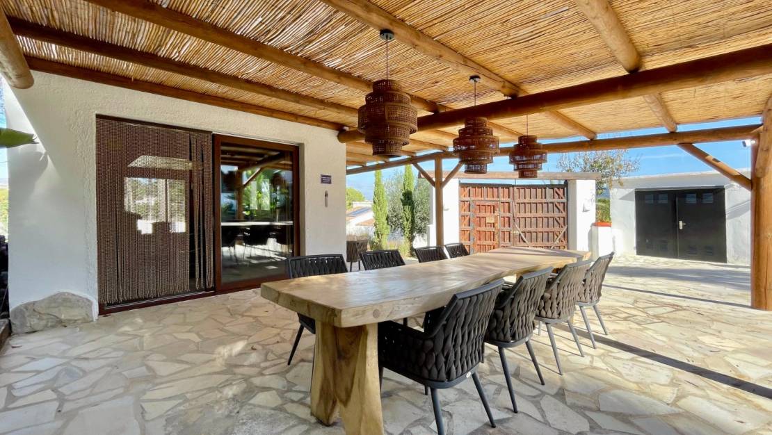 Помимо главного входа с пешеходной дверью, на участок можно попасть также с задней стороны через большие деревянные ворота или автоматические ворота. Здесь же расположены два гаража, один из которых в настоящее время используется как складское помещение, а другой переоборудован в уютную «мужскую берлогу». В доме просторная, уютная гостиная с большим количеством света, проникающего через французские двери, две спальни и две ванные комнаты, одна из которых примыкает к спальне. Кухня соединена с расположенной чуть ниже комнатой, которая в настоящее время используется как кабинет, а также имеет доступ к подсобному помещению. Рядом с гостиной находится еще одна прекрасная терраса с длинным столом под перголой и практичной летней кухней. Бассейн размером 8 x 4 м также окружен просторной террасой с уютной зоной отдыха.