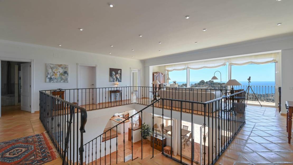 При входе вас встречает впечатляющая гостиная открытой планировки с потолком двойной высоты и элегантной галереей, создающая замечательное ощущение света, пространства и свободы. Окна от пола до потолка обрамляют непрерывный вид на море, обеспечивая постоянную связь со средиземноморским горизонтом.